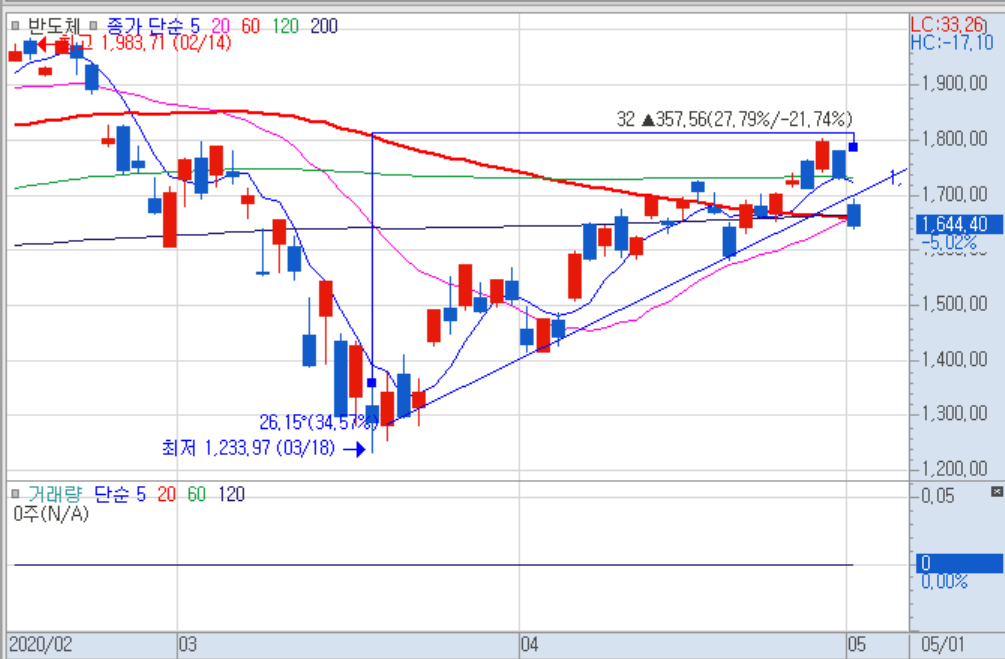 필반 - 반도체는 단순 기술적으로 보면, 하락세가 접어들었슴. 실물경기에서도 기업들이 많이 멈춰서서 실수요가 줄어들어서 그런듯 함.