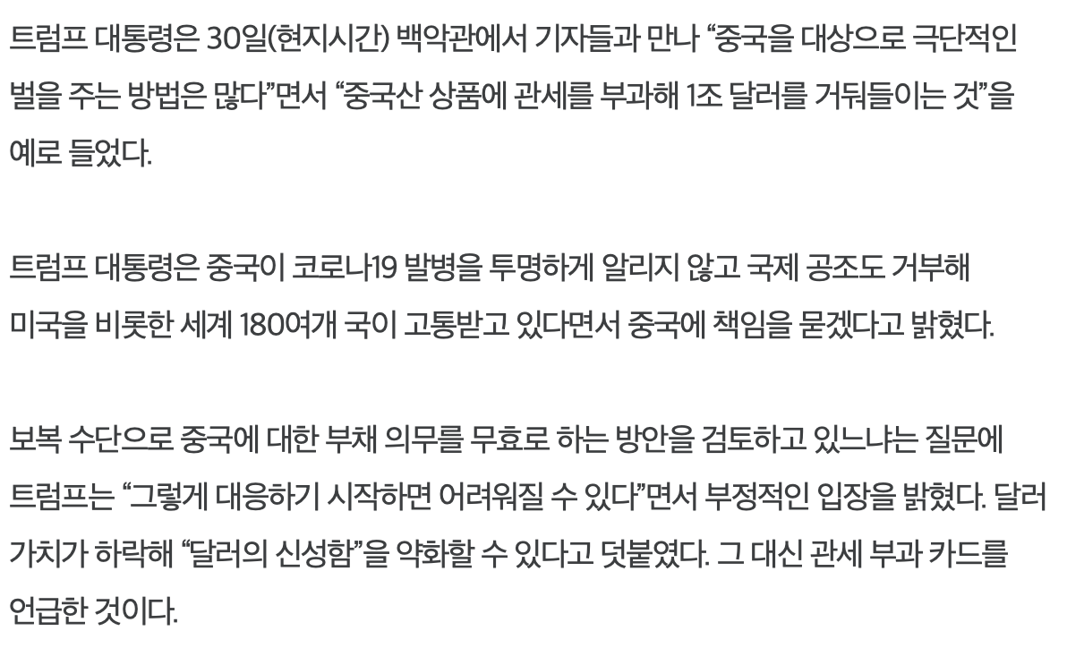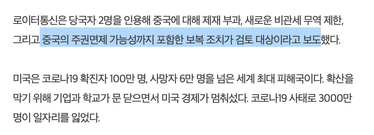 현재 각국에서 중국에 손해배생청구를 하려는 움직임이 보이면서, 미국이 저렇게 강경하게 나아간다면, 아마 저런 방식이든 유사방식이든, 아니면, 국가대 국가간 소송보다, 개인 혹은 단체가 중국에 소송을 제기할 가능성이 매우 높음.