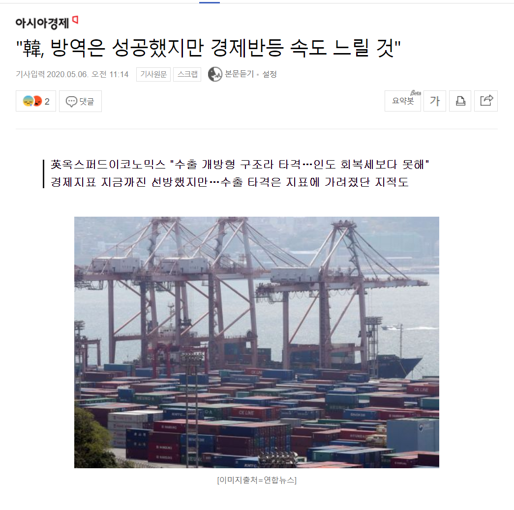 이유느 수출주도형 국가이기 때문에, 현재 전 세계가 자국중심으로 산업이 개편되고 있고, 코로나로 인한 국가간 봉쇄가 언제쯤 정상화 될지 알 수 없기 때문임.