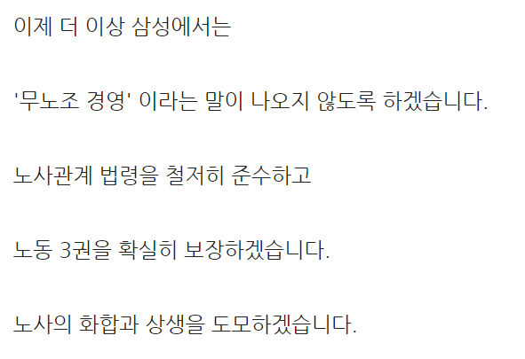 무노조 경영 더이상 하지 않겠다... 지금의 글로벌 탑 삼성을 만든 삼성의 무노조 경영은 세계적으로도 유명함.