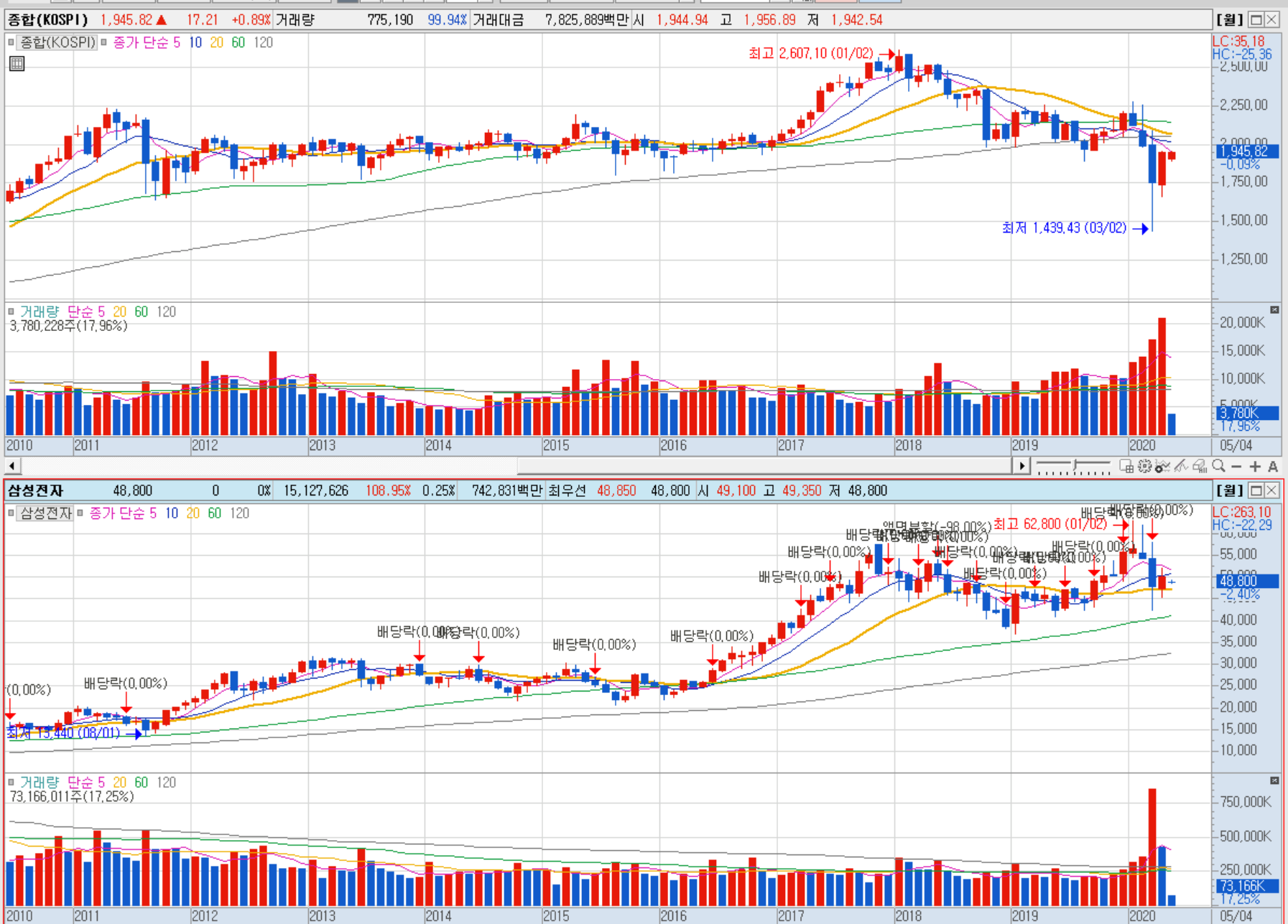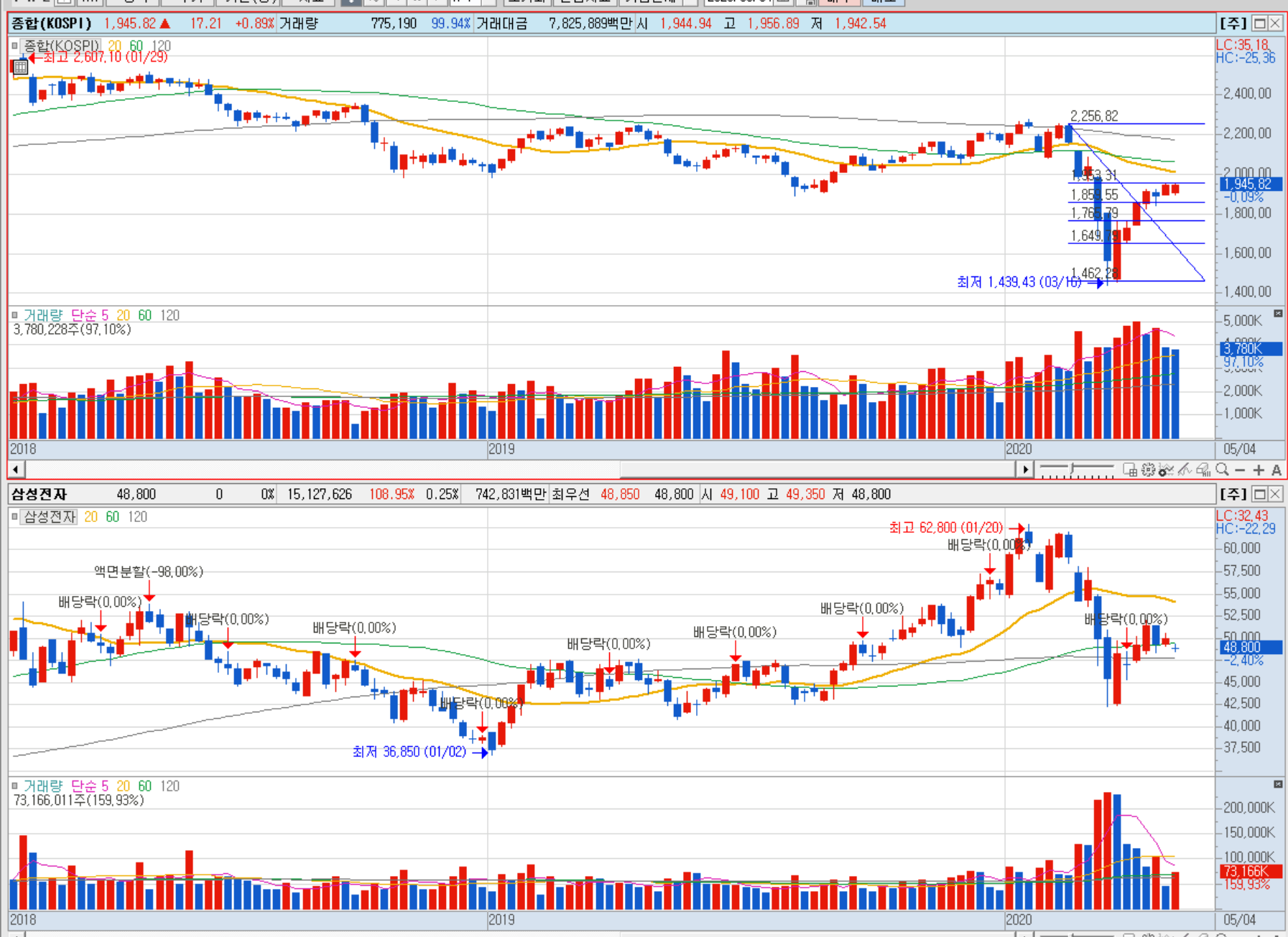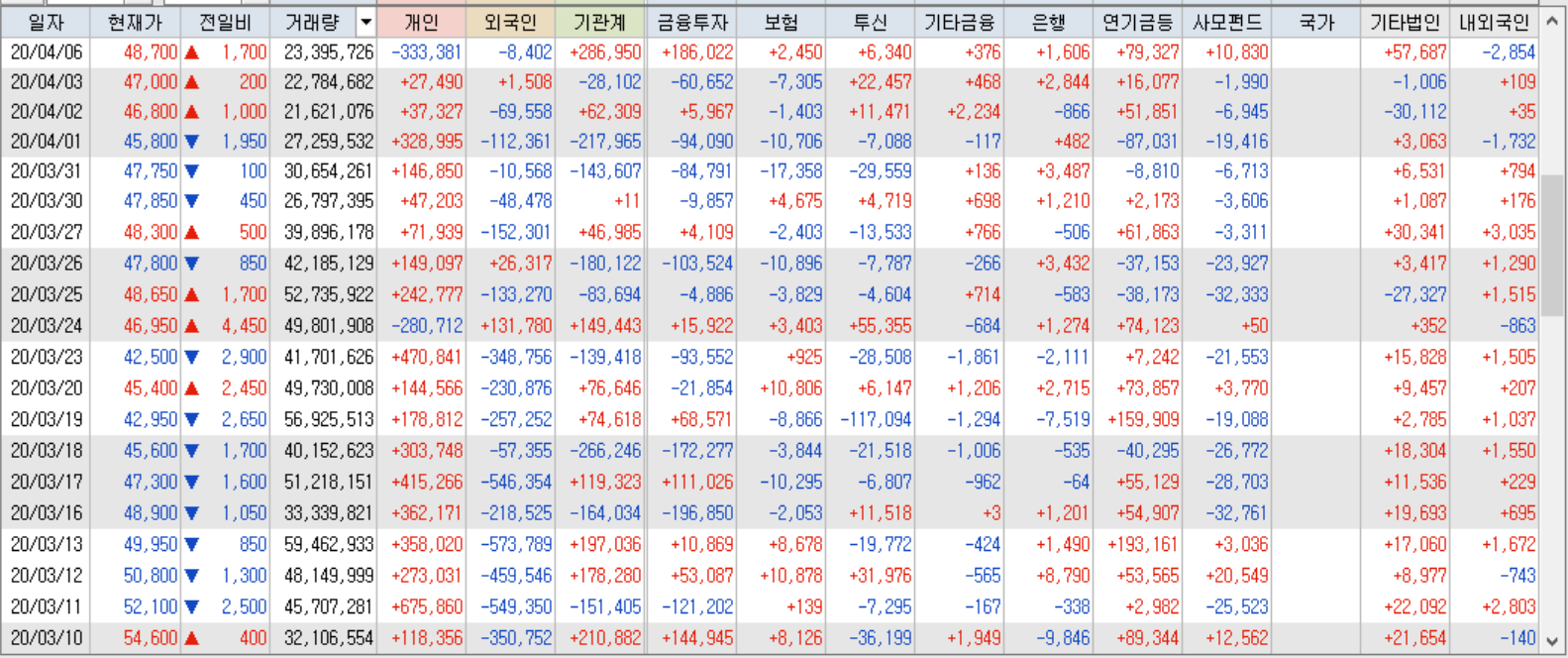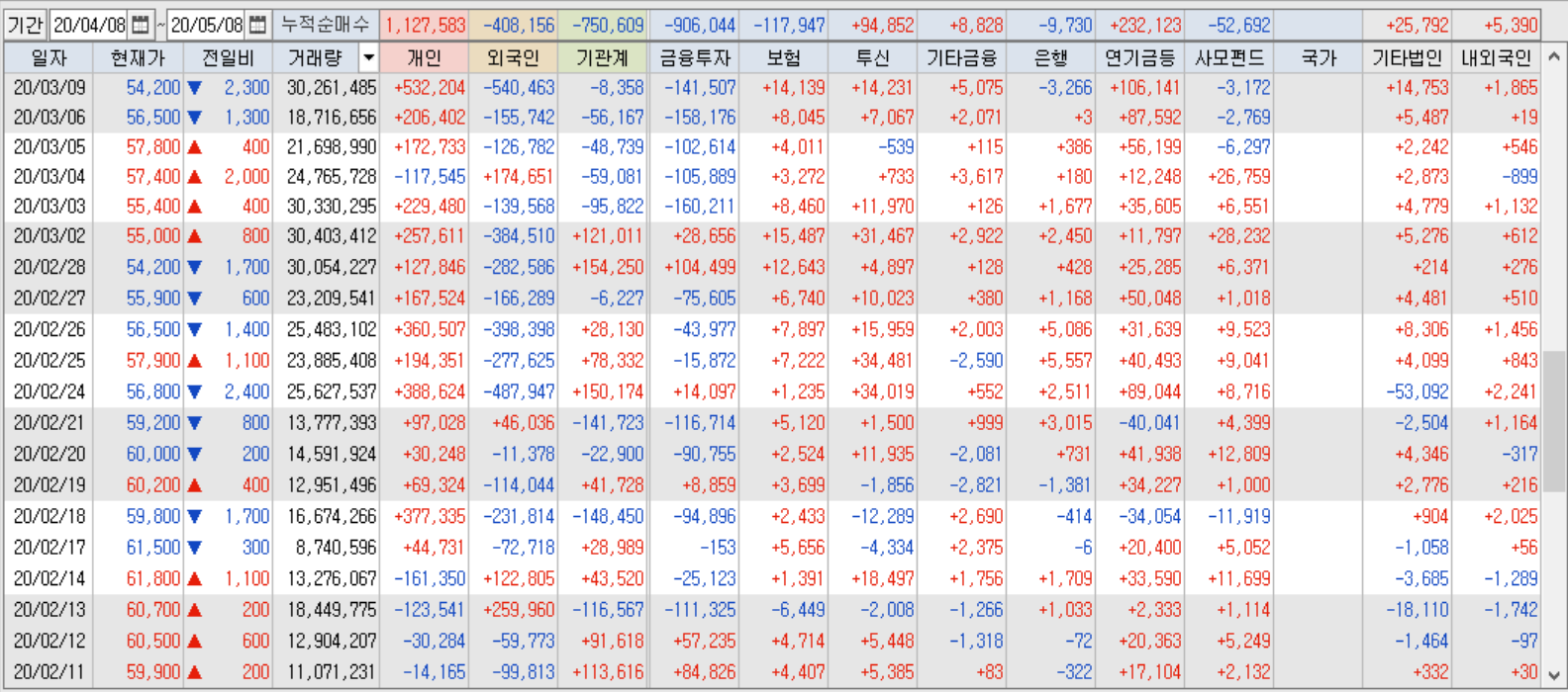 2월부터 대략 코로나가 본격 터졌으니까. 그때부터 외국인은 주구장창 삼성전자는 매도중이고, 동학개미 기사가 등장하면서 개인들만 삼성전자를 사들이고 있슴..