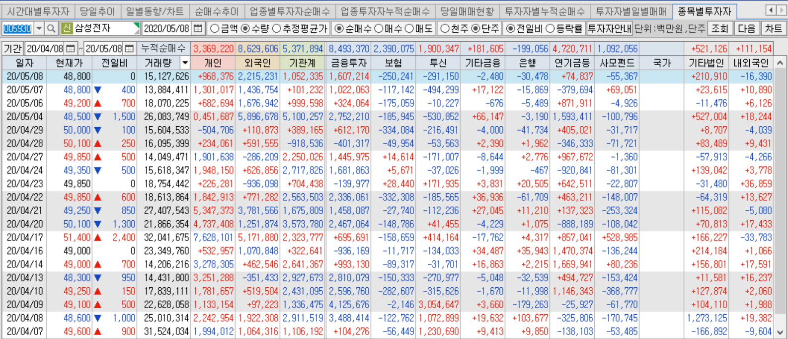 헌데 재미있는 사실은 삼성전자가 이번주봉에서 거래량이 늘어서 투자자별 조사를 해보니.. 개미만 사고 있슴.