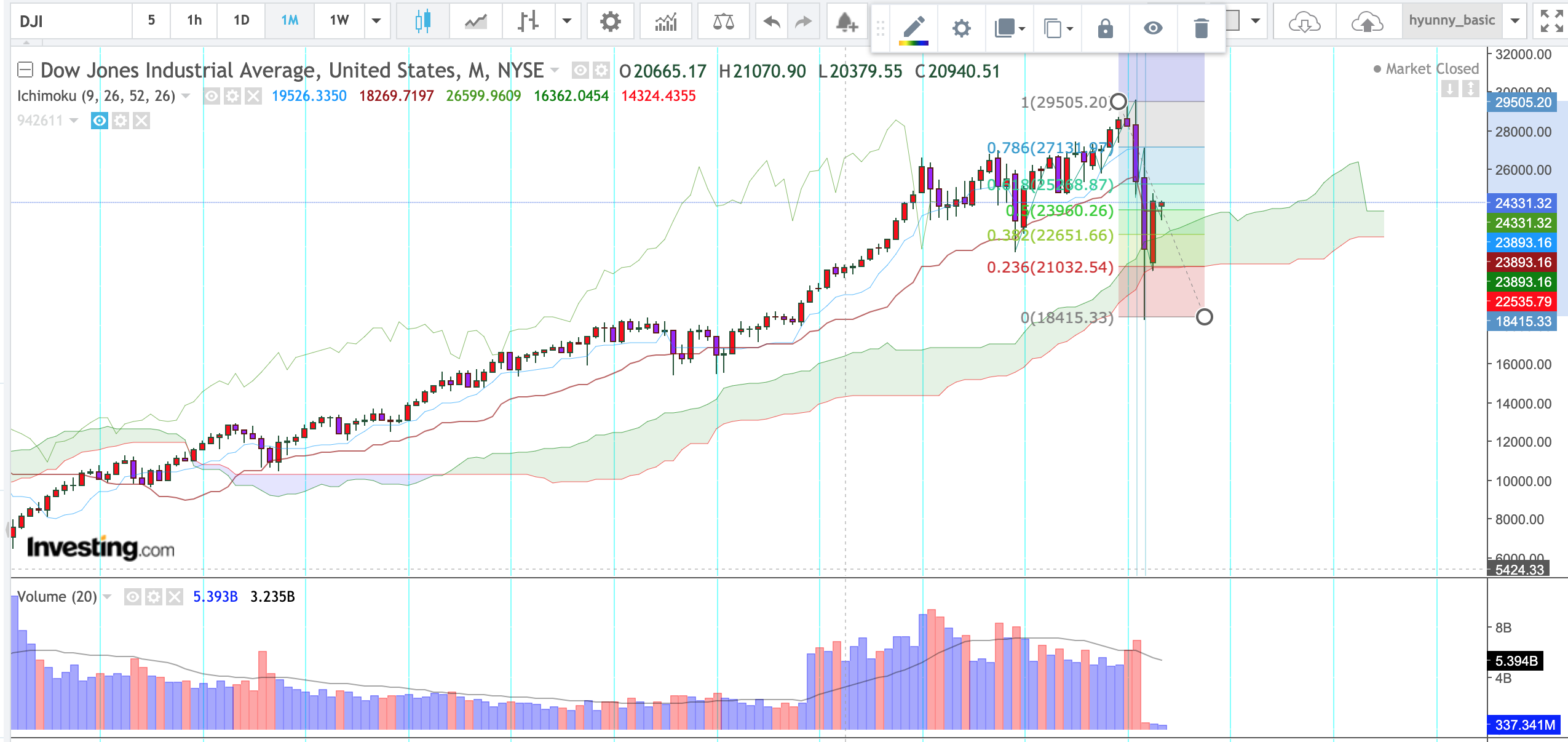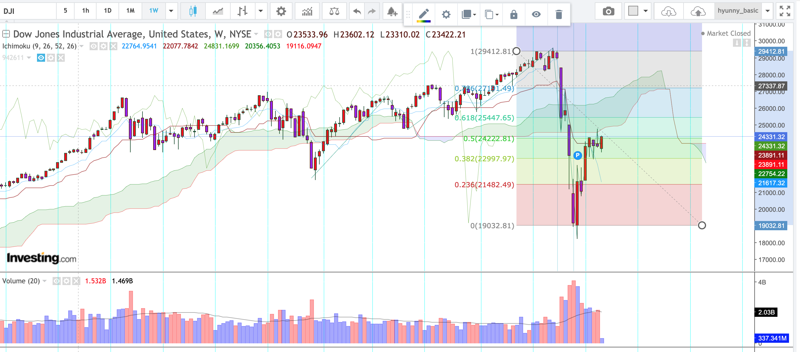 다우지수 - 주봉이 애매한 상태로 마감하거 같음. 0.5 지점을 확 뚫은것도 아니고, 윗꼬리달고 아래로 확 빠진것도 아니고.. 뭐이런... 미국도 뭔가 경제가 갈팡질팡 하는 기로에 서있다 볼 수 있슴.