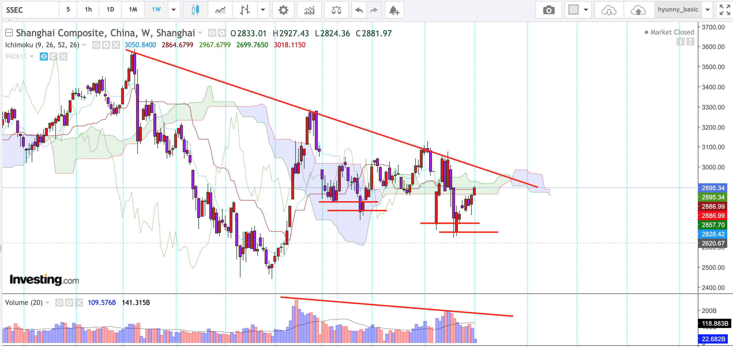상해종합 - 주봉인데. 그냥 지속적으로 저점이 낮아지고 있슴. 중국은 내부상황을 기사로 잘 내지 않고 있기 때문에 뭐라 말 할수가 없지만, 그냥 지수 챠트로보면 중국도 점점 금융경제가 어려워 지고 있다 판단할 수 있슴.