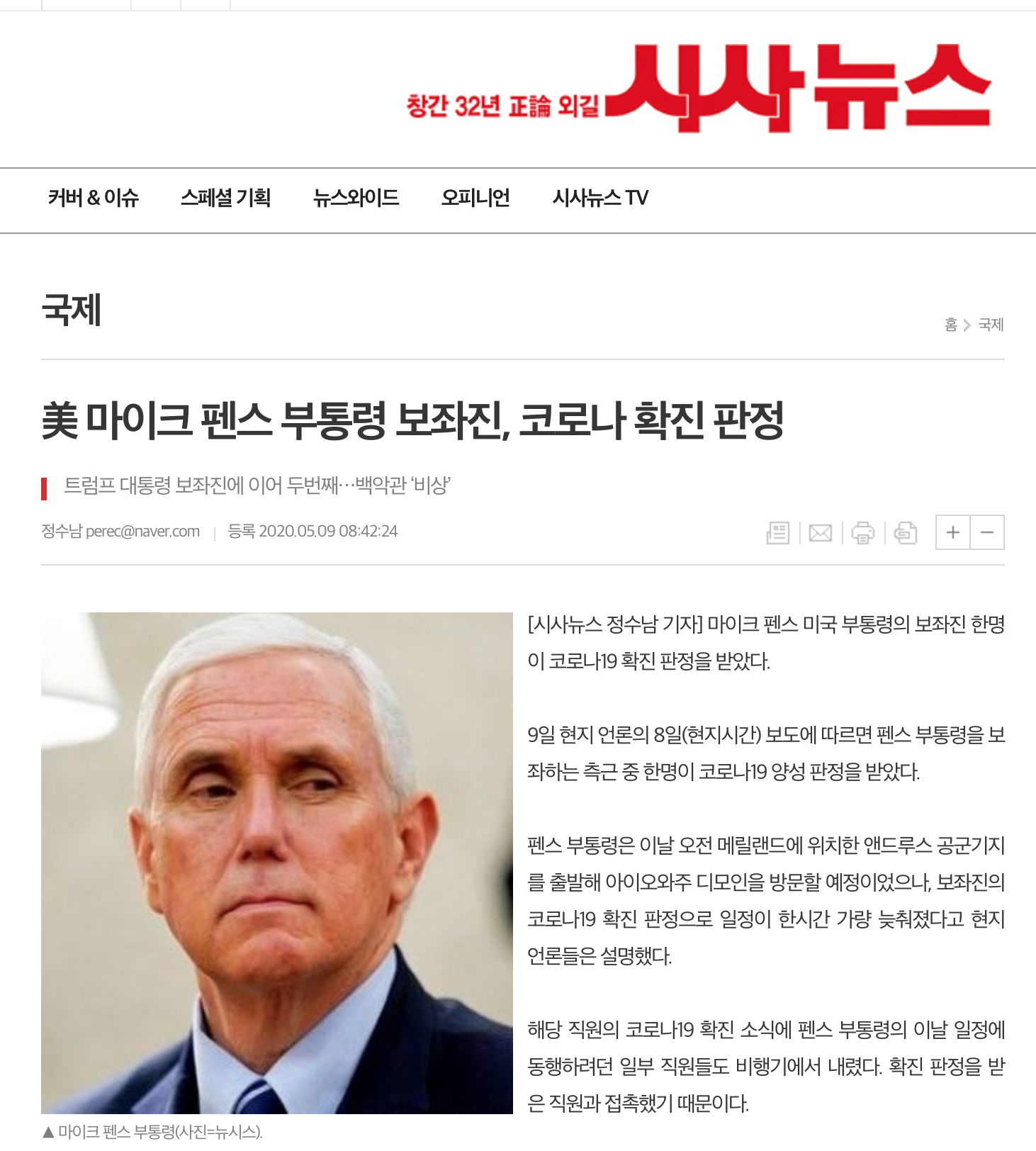 펜스 보좌진 코로나 양성.. ㅎㅎㅎ 뭐 한명정도는 걸려줬다 기사가 나와야지..