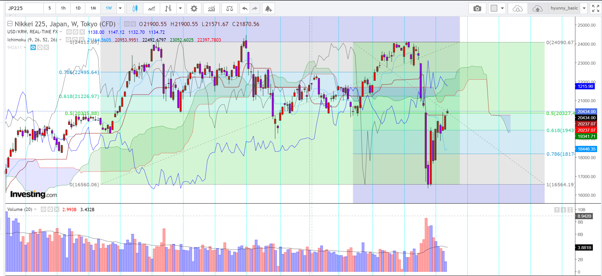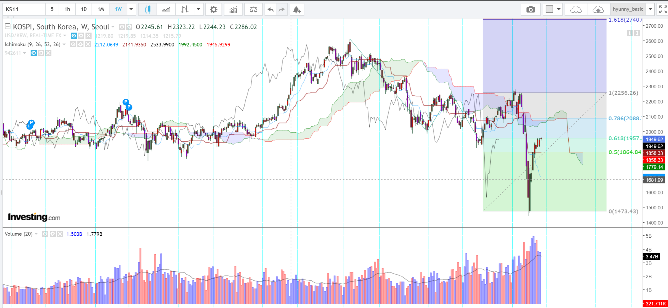 코스피는 2018년 기점으로 하락추세에서 코로나 급락 나왔고, 61.8%까지 반등했슴. <=== 요거 좀 꺼림칙함..