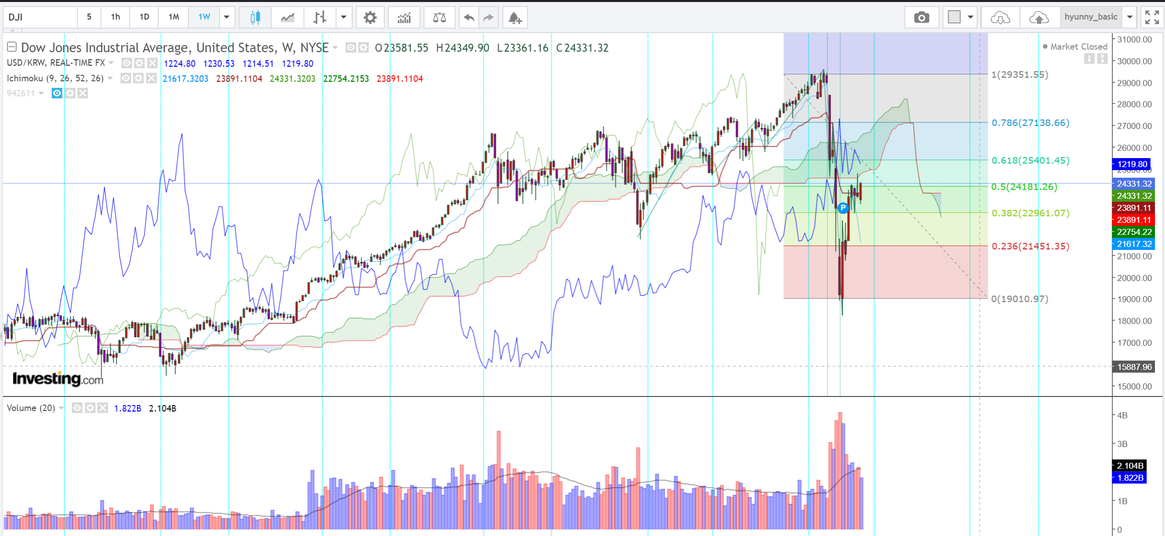다우 - 50%지점을 뚫고 마감해서, 새로운 한주의 시작가가 매우 궁금한 상황임. 시작가로 대략적 방향을 알수 있지 않을까 상상을 해 봄.