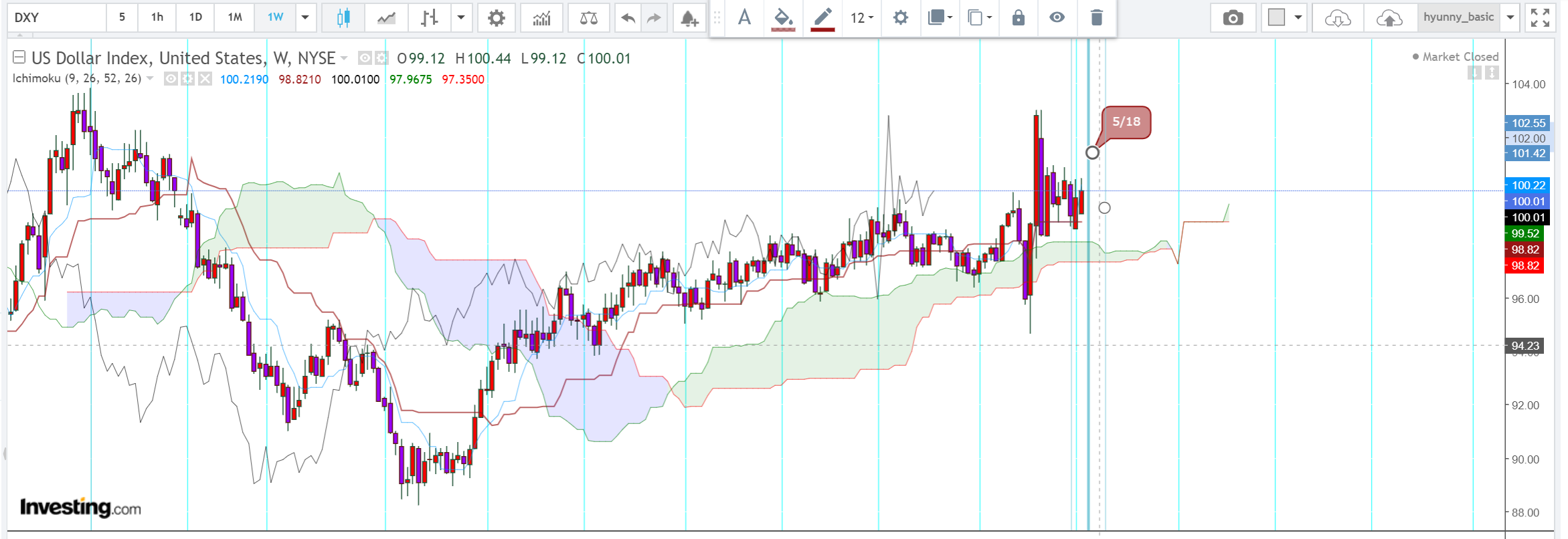 달러인덱스 - 내일 만기일이고, 지속적으로 100을 넘긴상태로 가고 잇슴. 조심하자.