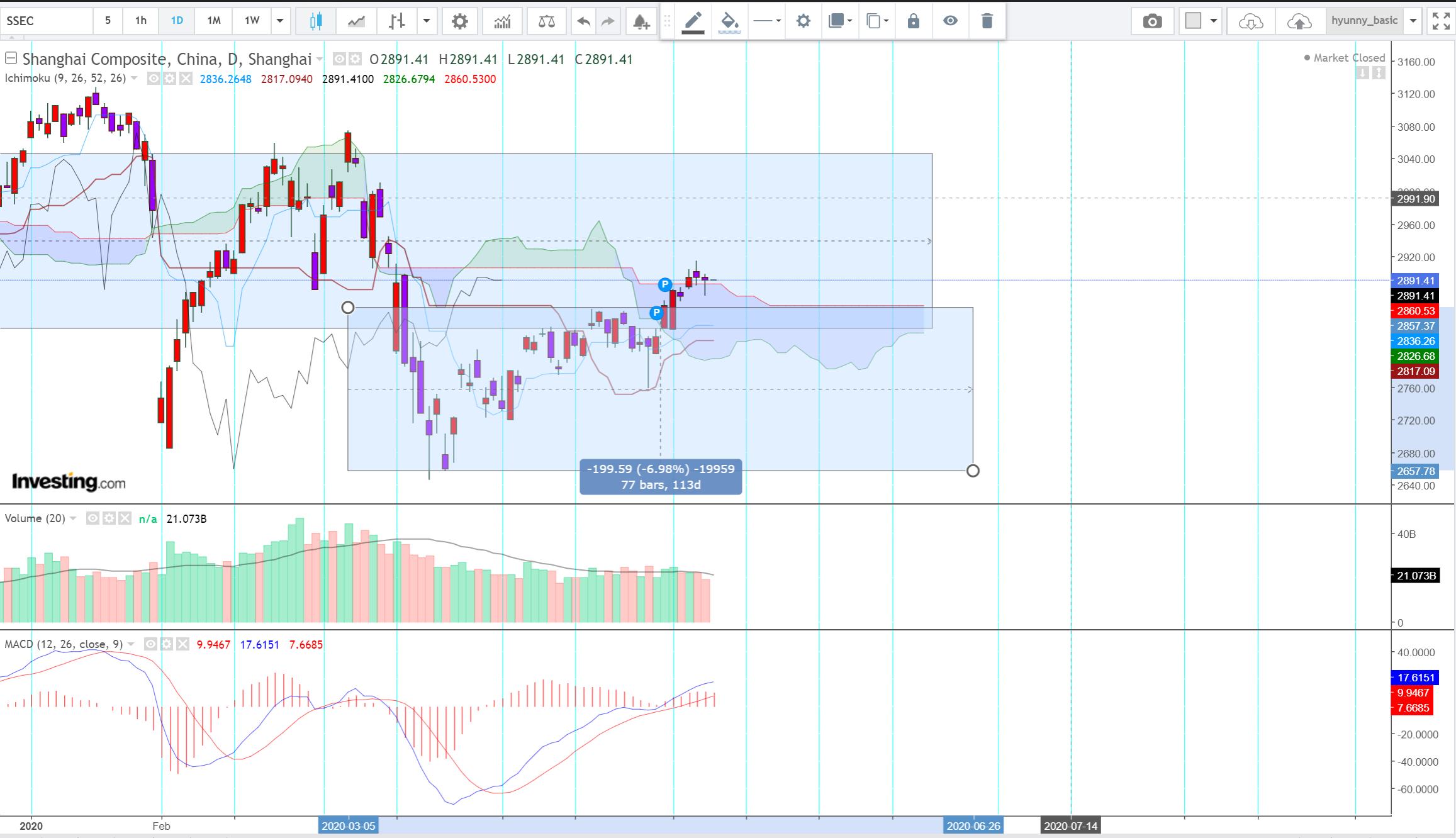상해종합 - 박스권 위로 올라갔고, 일목균형표상으로도 오르는 모양새인데... 미중무역 기사를 잘 확인할것.