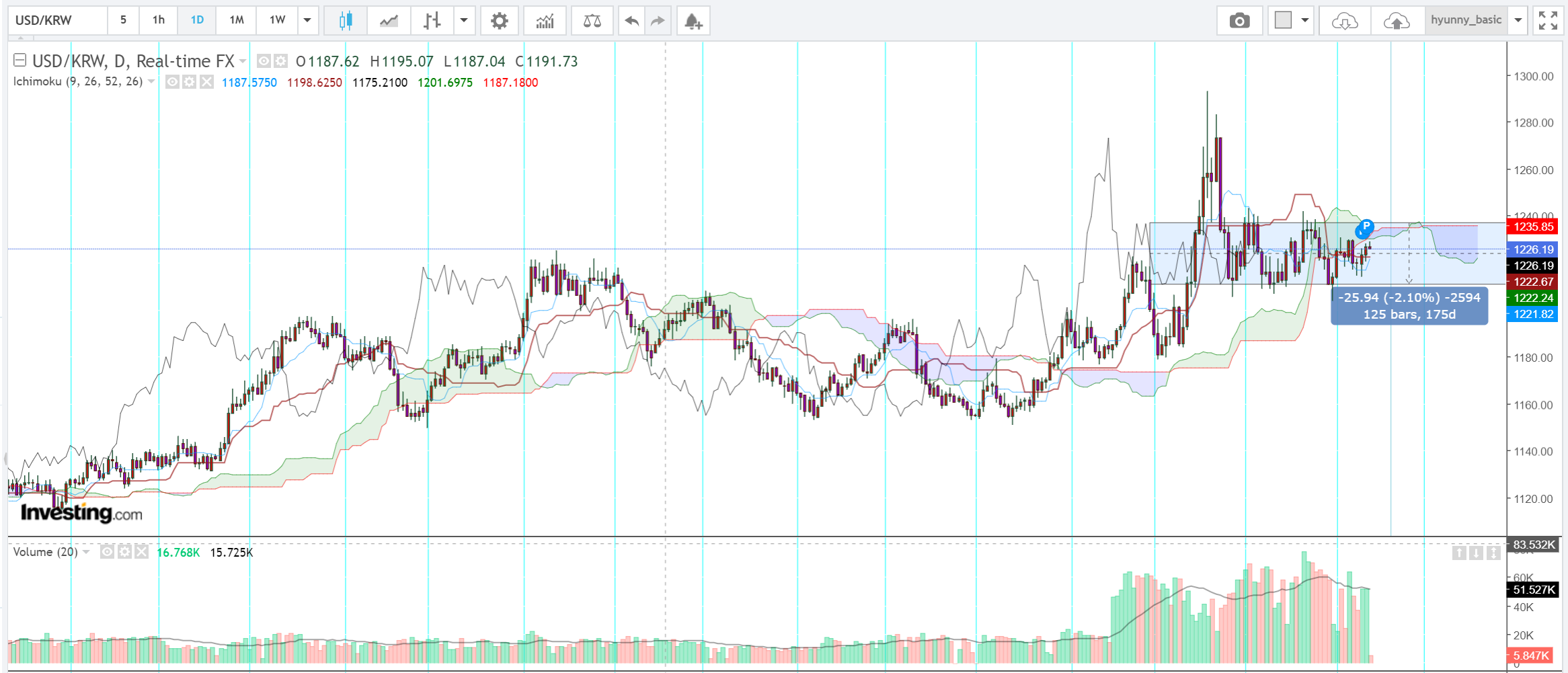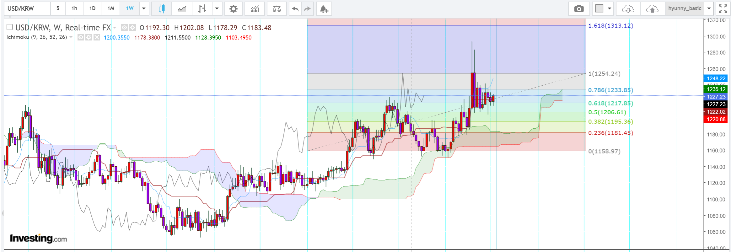 달러원 - 주봉으로 보면.. 좀더 오를거 같음.. 일단 조심해야 함. 달러인덱스도 지속적으로 100이상에서 놀고 있슴. 뭔일이 생길지모르니 항상 조심.