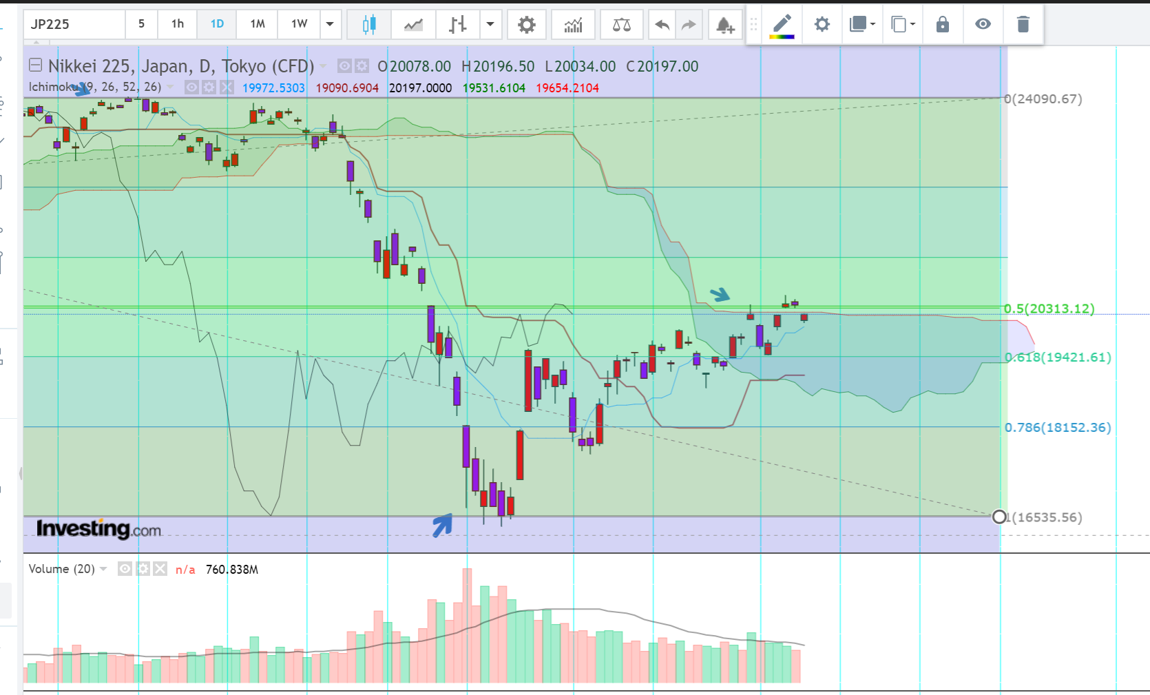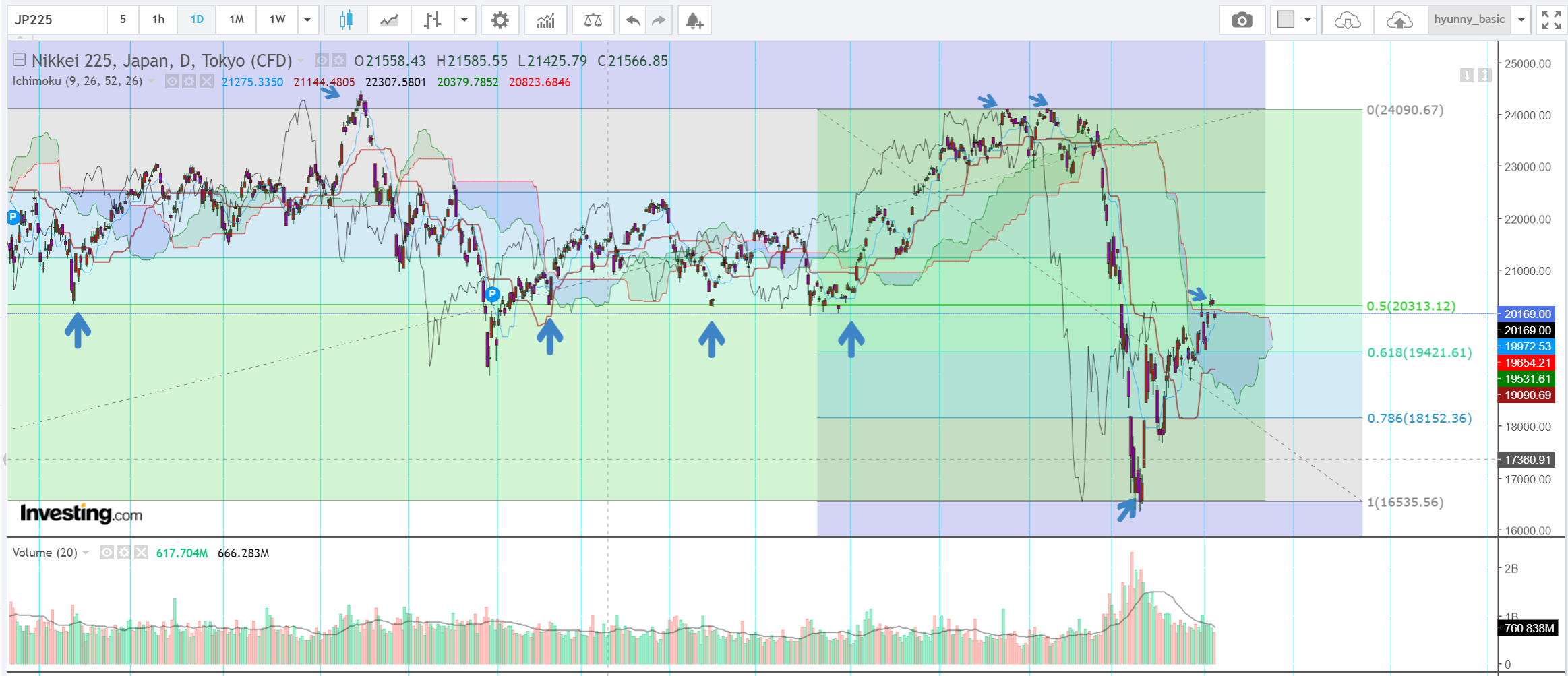 Nikkei - 박스밴드 상단맞고 다시 아래에서 시작.