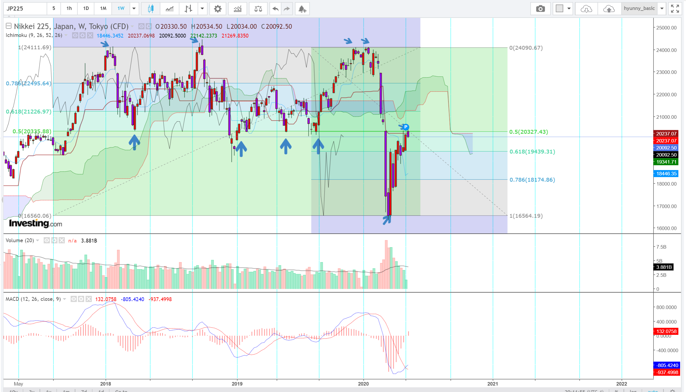 Nikkei - 상단밴드 맞고 내려올지.. 위로 뚫고 올라갈지.. 다음주봉까지 봐야함.