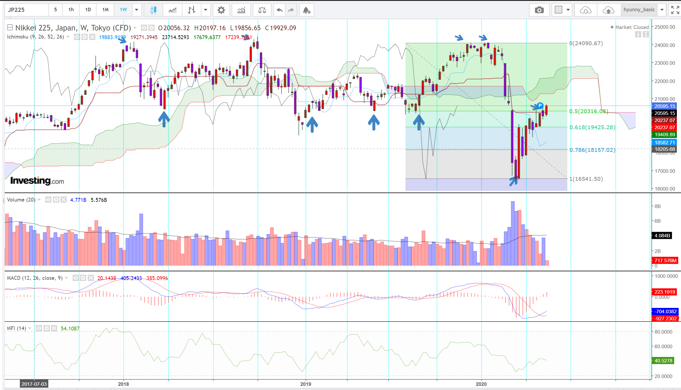 니케이 - 61.8% 라인을 지지하고 올라설거 같음. 아시아는 다 상방모드로 전환중인듯 함.