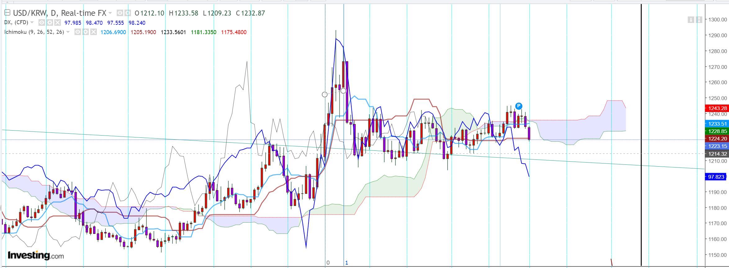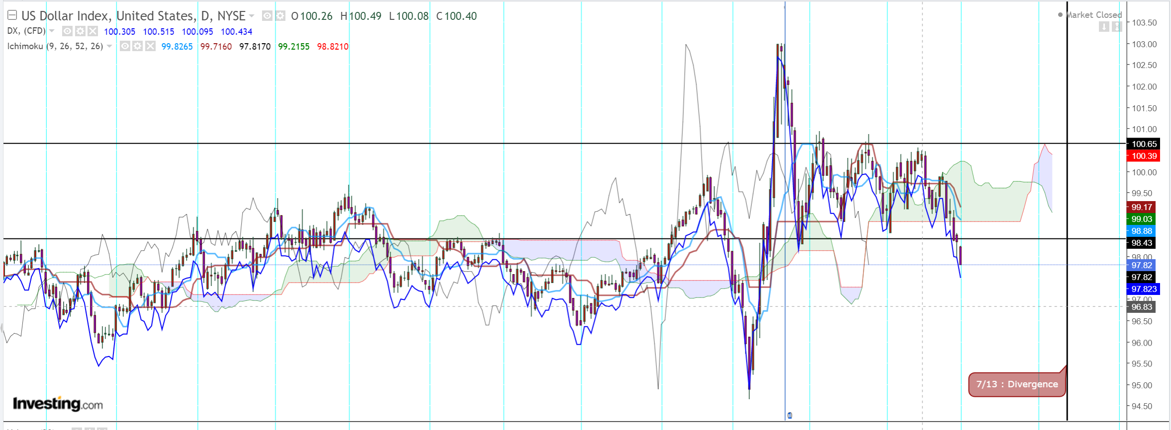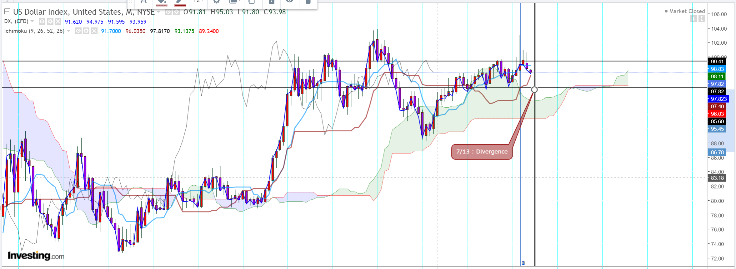 달러인덱스 - 박스권 이탈하여 내려오고 있슴. 지수 더 오를수도 있는것에 대응해야 함.