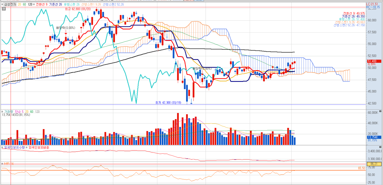 금일 전 고점을 돌파할 것으로 보였으나, 51500원 이상 돌파하지 못하였습니다.