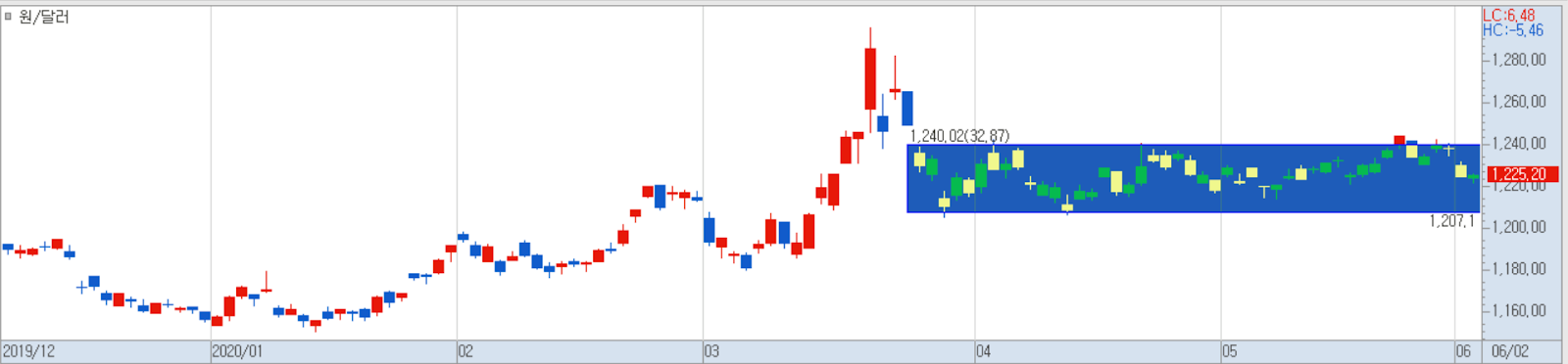 환율은 현재 박스권 내에서 움직이고 있으므로, 환율에 의한 큰 움직임은 없는 상황입니다.