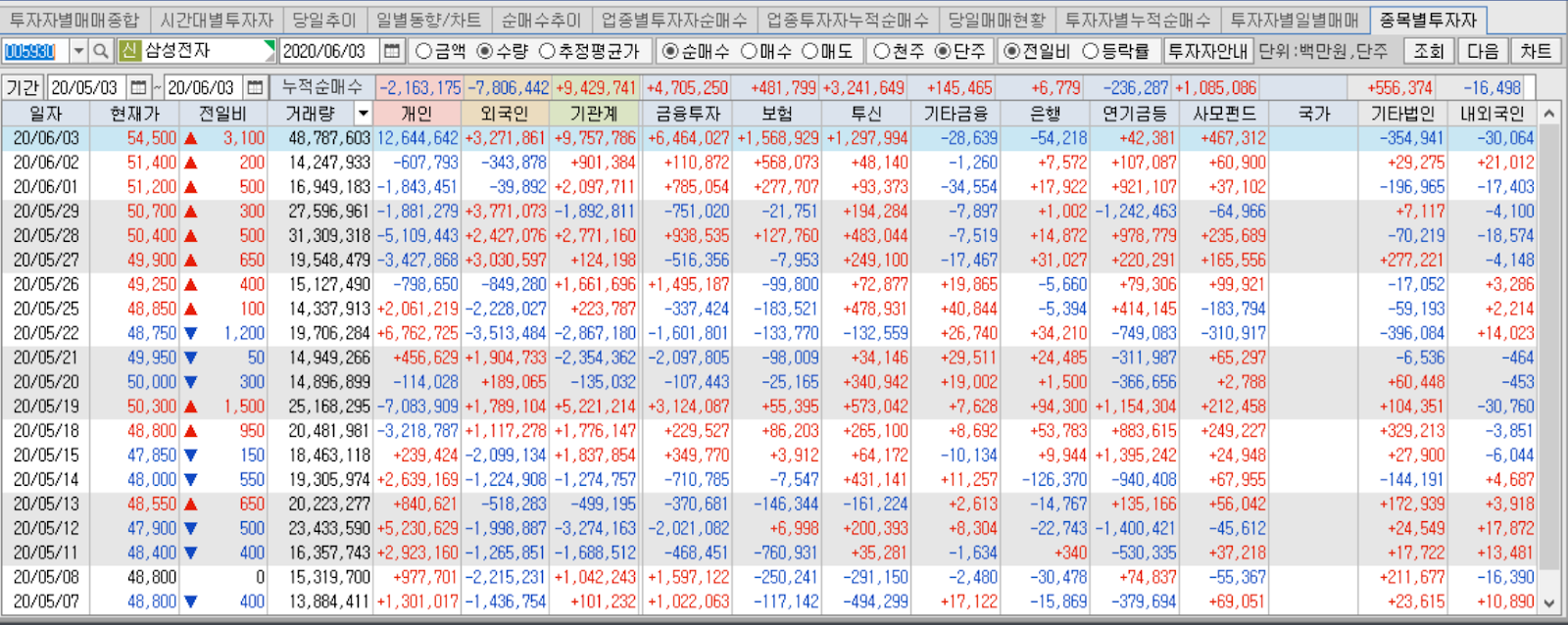 삼성전자 투자자별 수급 현황 입니다.