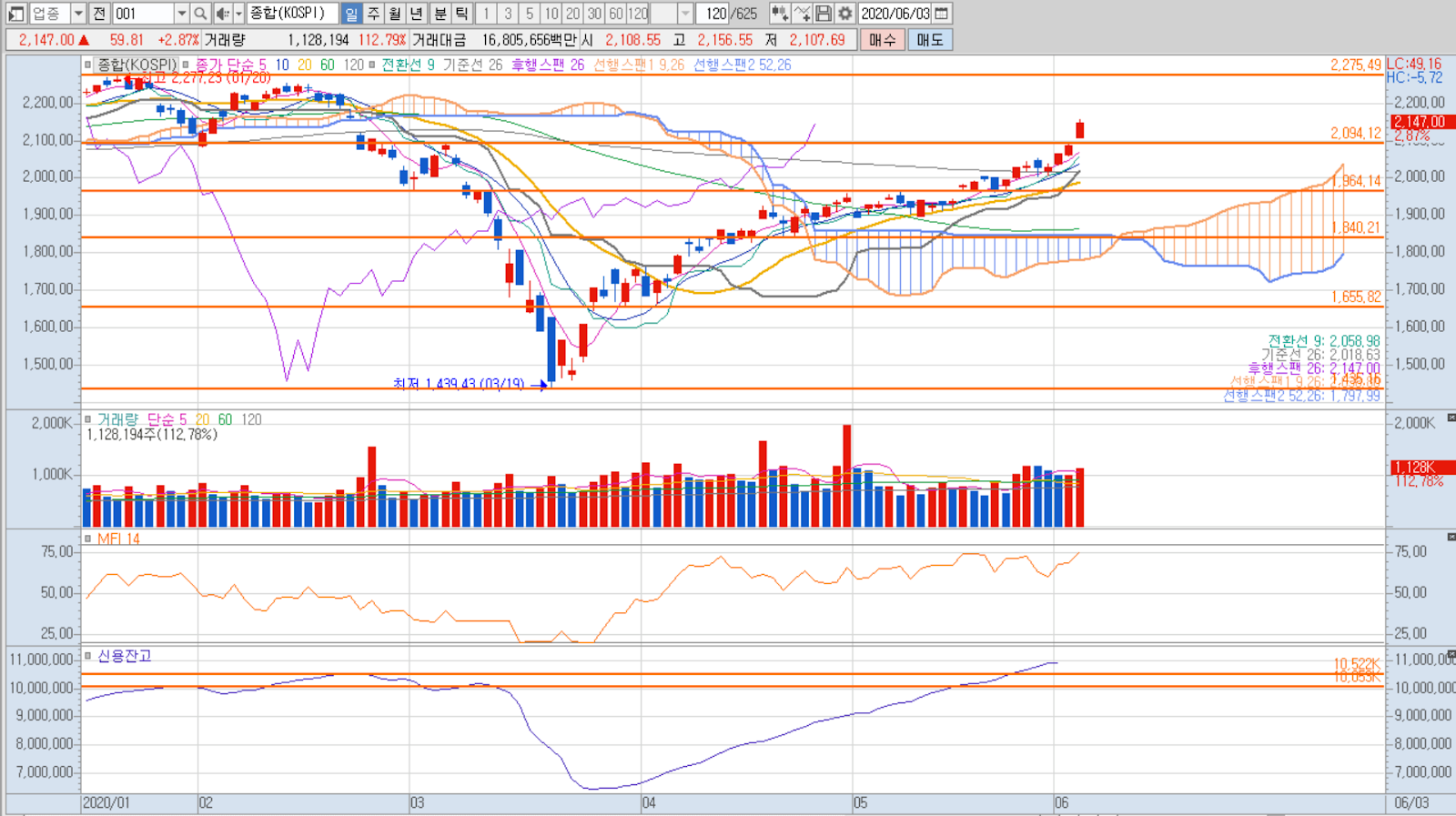주봉상으로는 120주선을 터치하고 저항테스트를 받을 모양새 입니다.