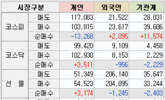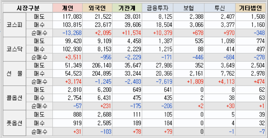 외국인과 기관은 현물매수, 선물은 매도 포지션 이었습니다.