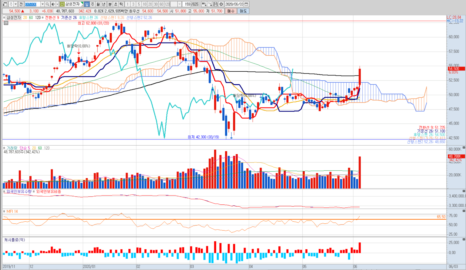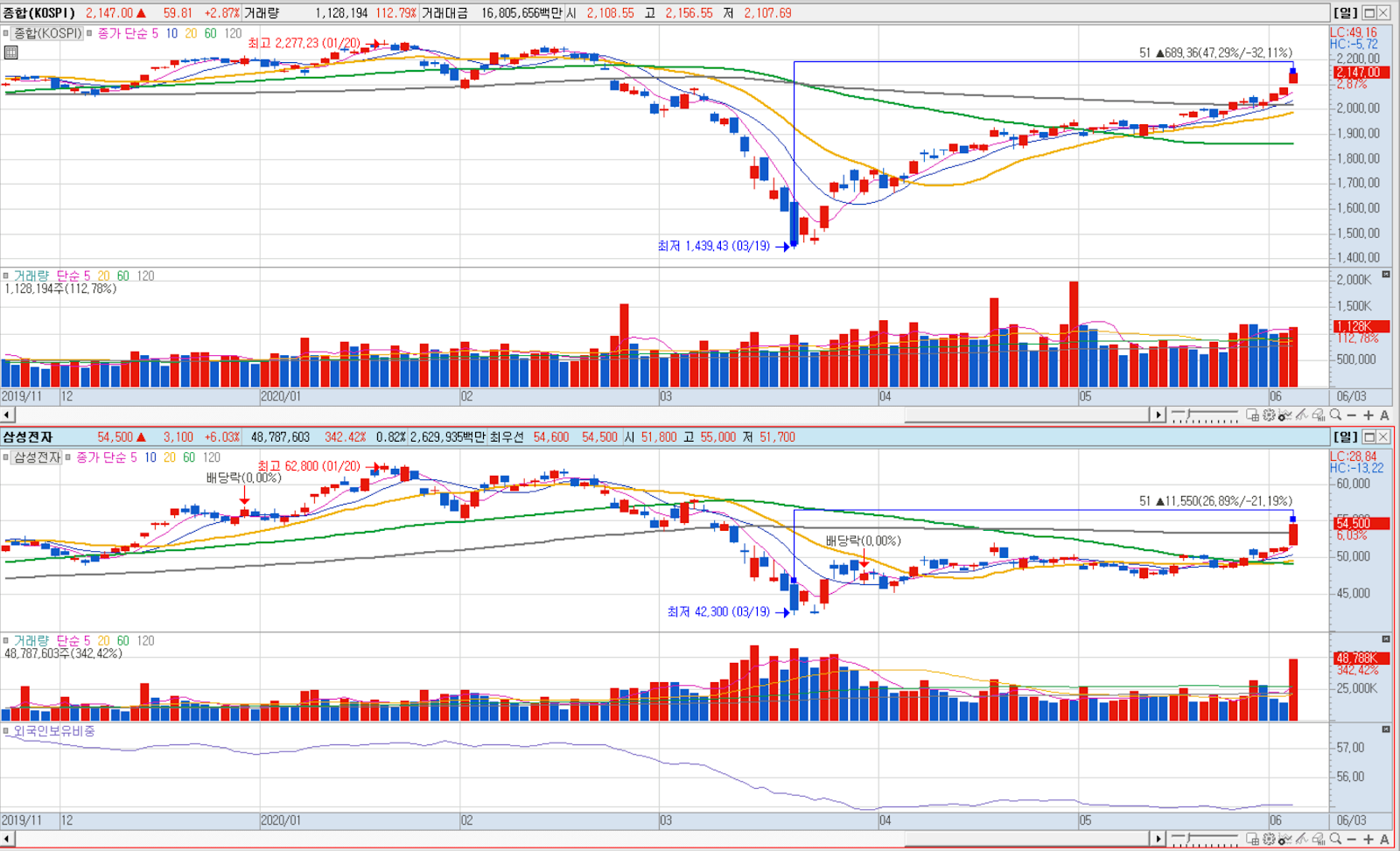 55000원 터치하였고, 다음 고점이 57000원대를 돌파할지 지켜봐야 하겠습니다.