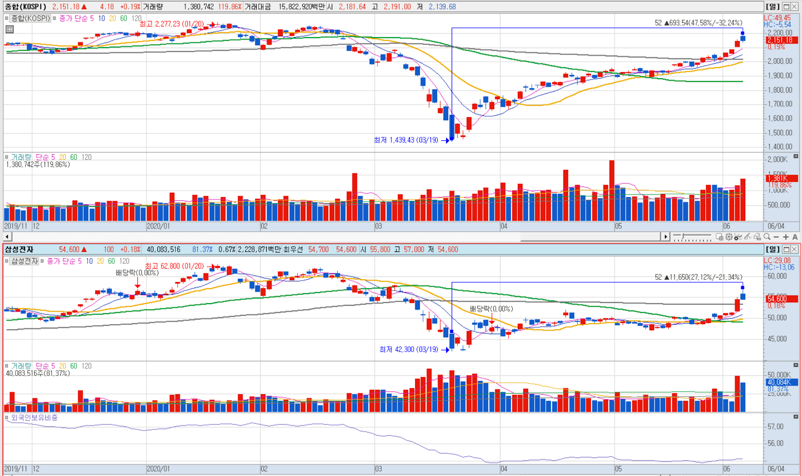 코스피가 오른만큼 삼성전자는 오르지 못하고 있는 상황입니다.