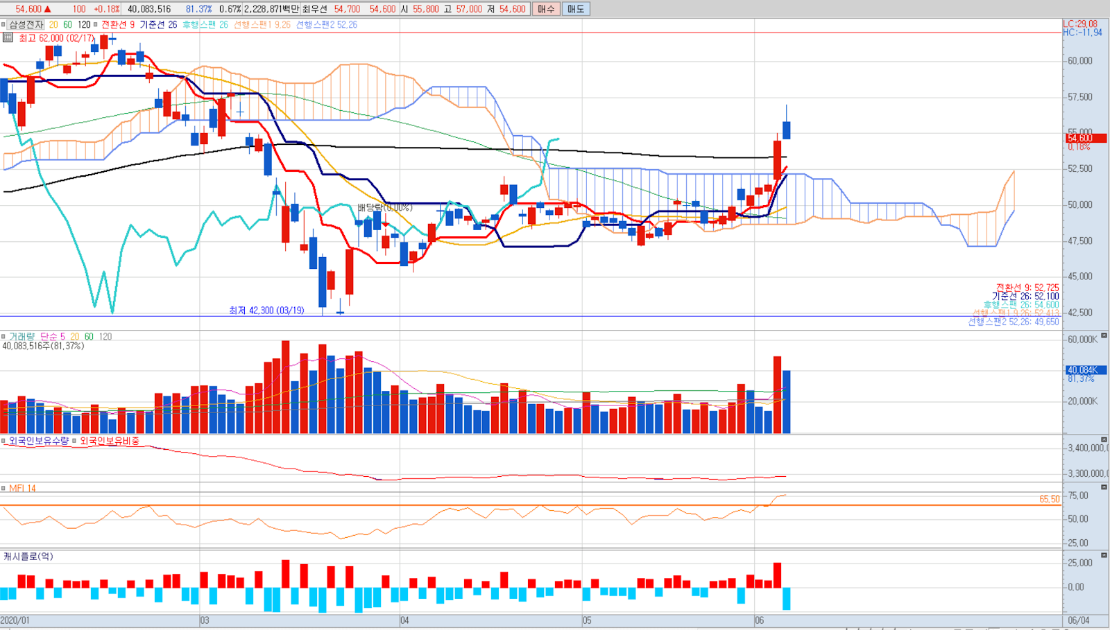 금일 장초반에는 삼성전자가 강하게 상승하여 , 3월 초반에 발생한 갭 하락부분을 메울것으로 보였으나, 후반으로 갈수록 힘이 약해졌고, 지수 또한 후반으로 갈 수록 약해지는 모습이었습니다.