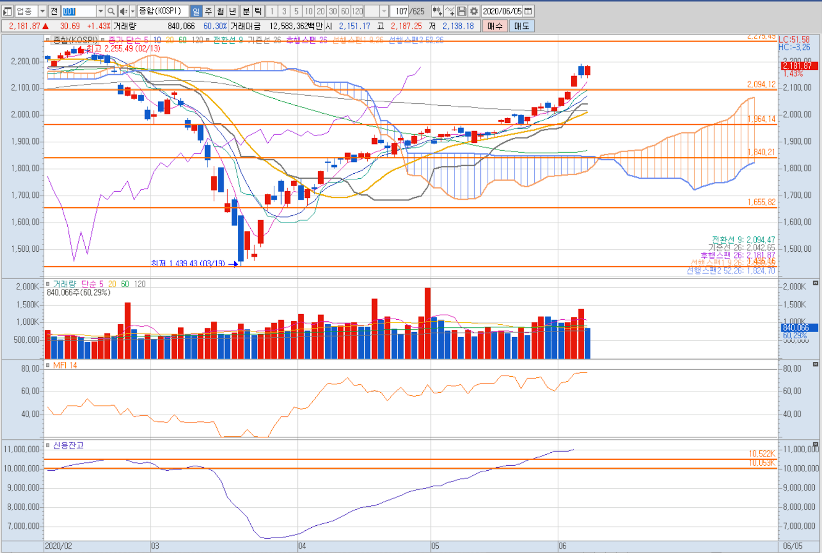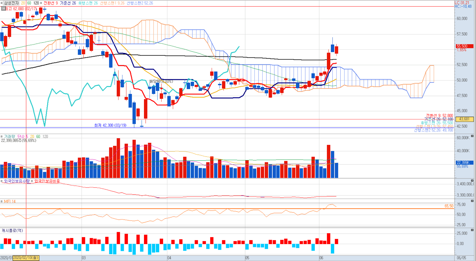 삼성전자의 흐름이 6월 3일 구름대를 상승돌파 하면서 강한 흐름이 이어지고 있습니다.