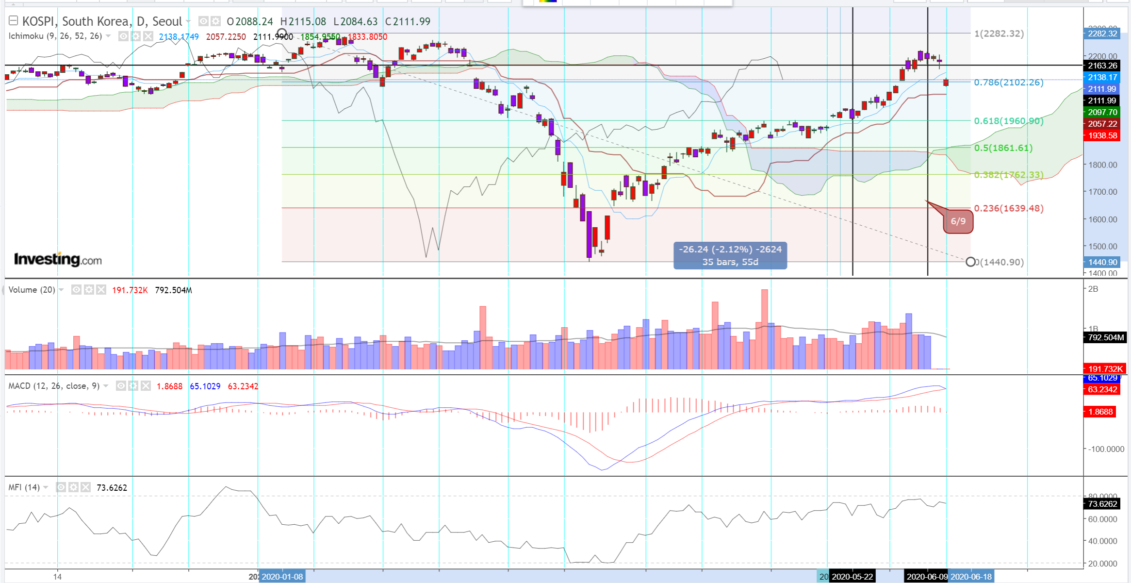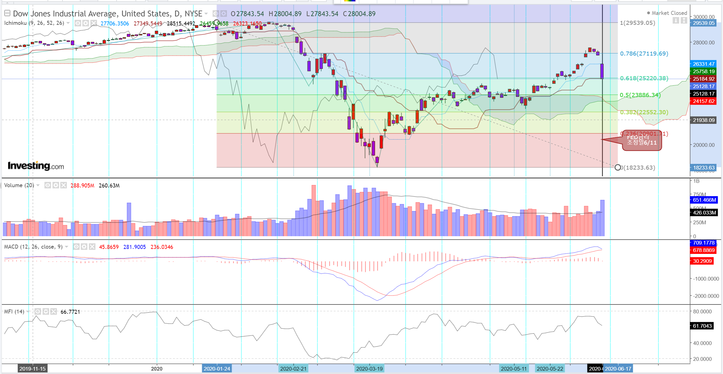 kospi - 78.6% 지지테스트 들어간거 같음. 다우가 선행이라 본다면, 우리도 61.8%까지 내려갈 가능성은 염두에 두어야 함.