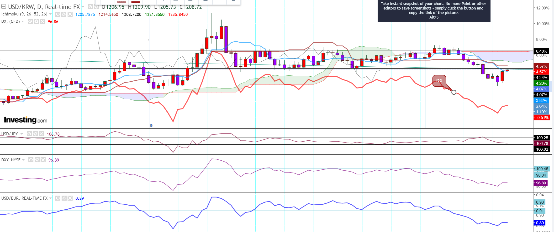 환율 - 급등까지는 아니고 그래도 올랐슴. 단기급등이라, 좀더 봐야하고, 달러인덱스 포지션이 주말에 어떻게 변하는지보고 다음주 대응.