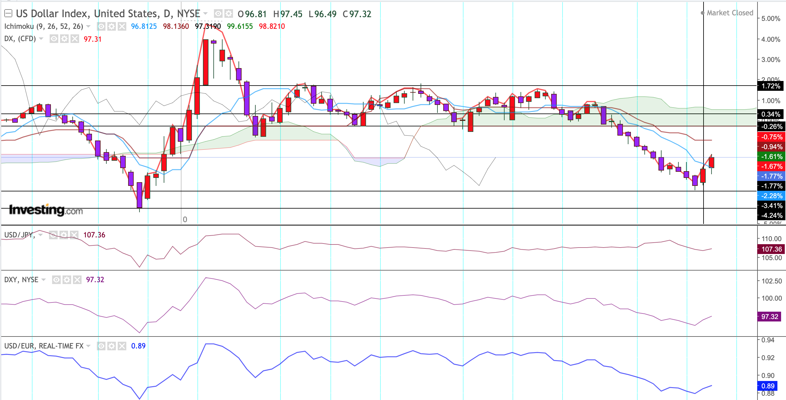 달러인덱스 - 다시 오르고 있슴. 다우 조정좀 주나?