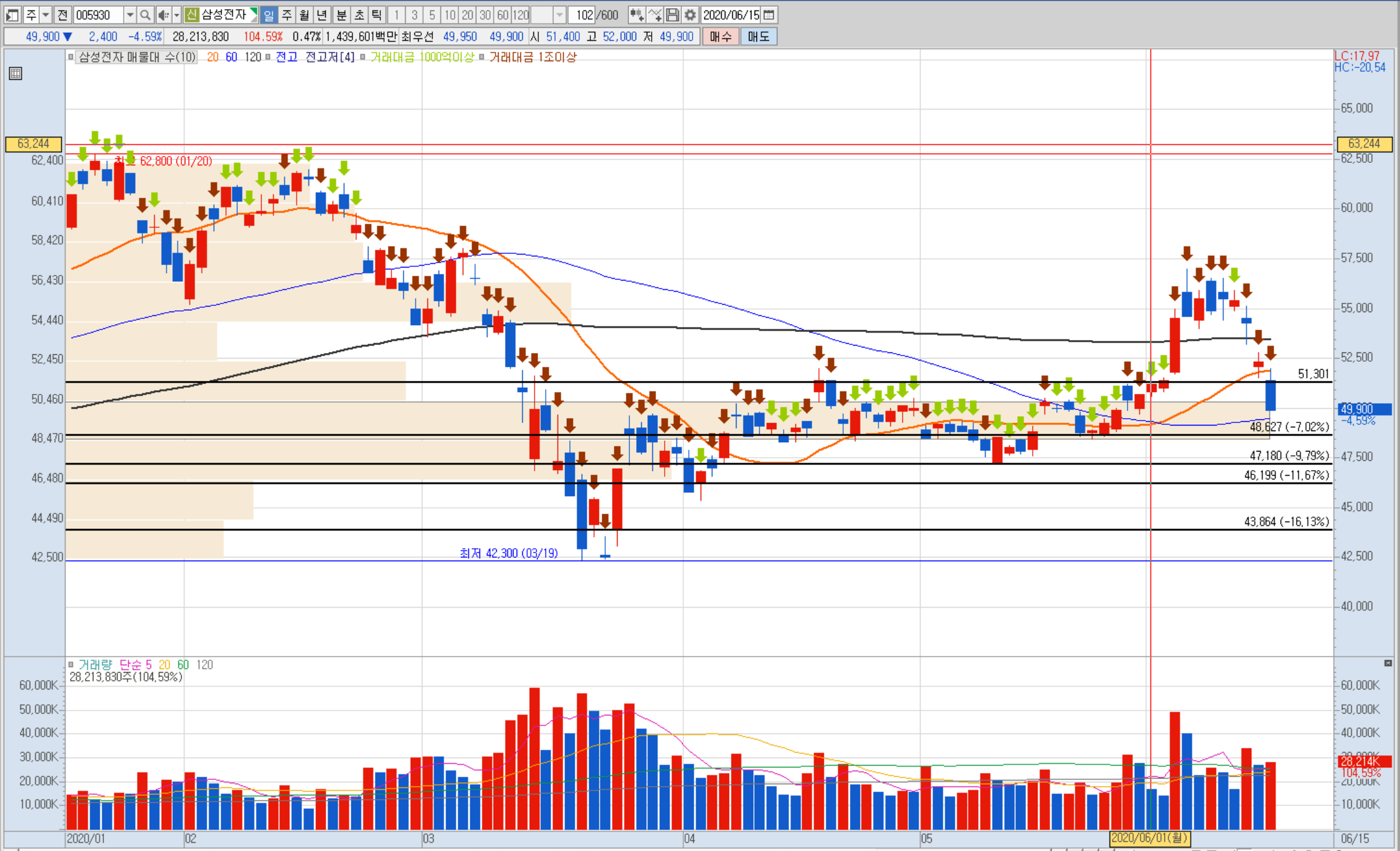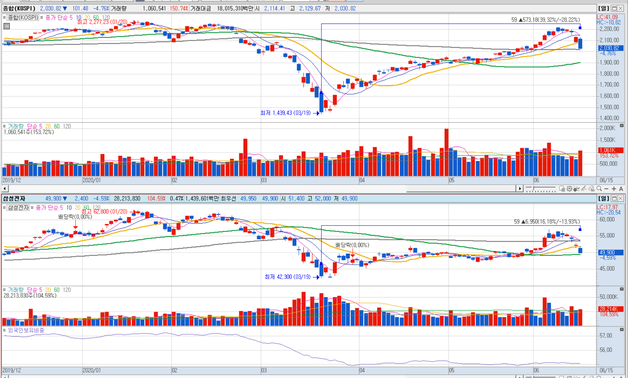 지수와 삼전 - 지수 120선 지지 테스트. 오늘 장대 음봉이니 내일 양봉함 주나? ㅎㅎ 바로 깨주면 더 좋고.