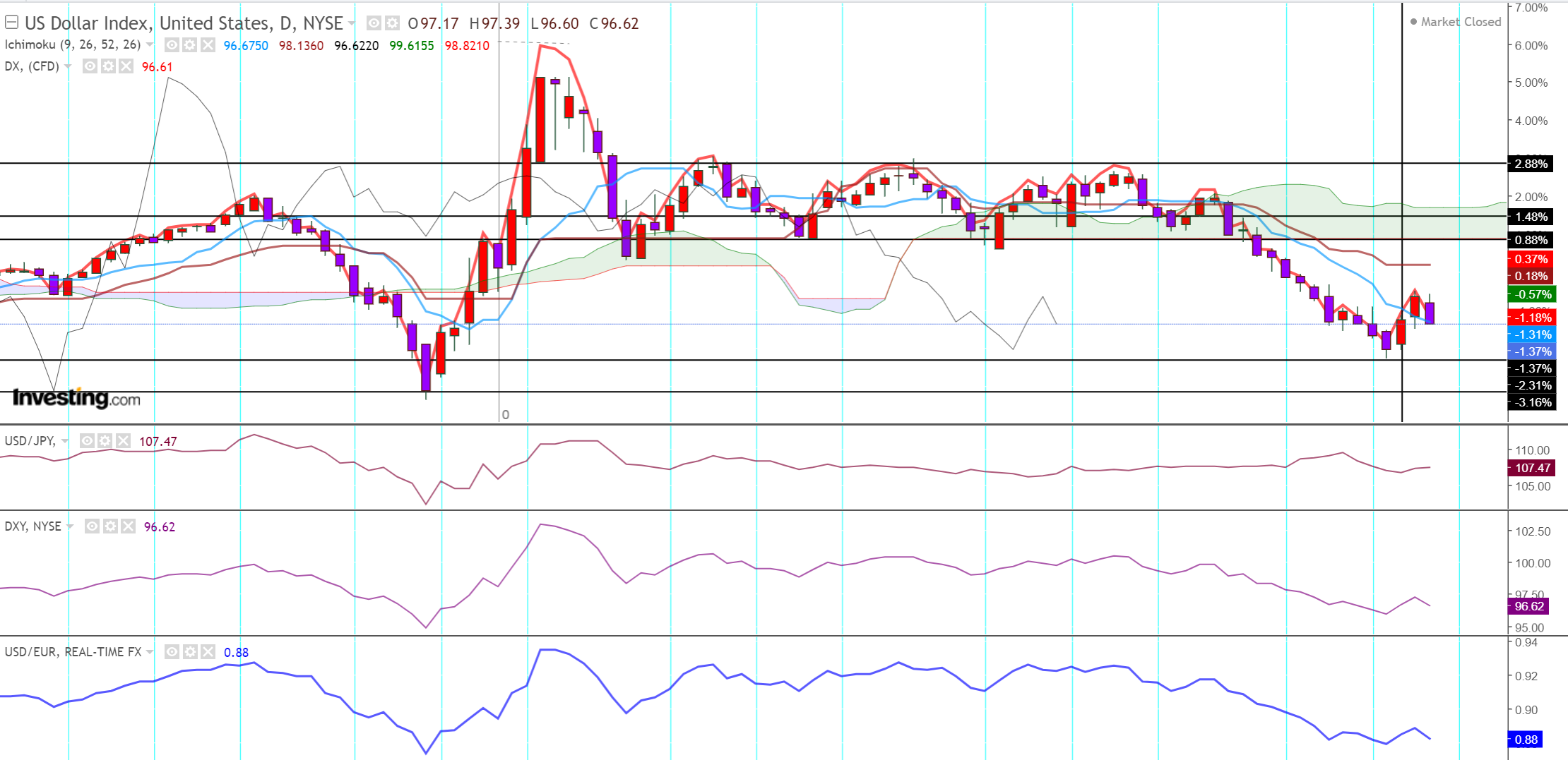달러인덱스 - 달러 유로 풀리고 있고, 엔화는 그대로인듯.. 엔화는 이제 더이상 풀지 못하는 상황인가?