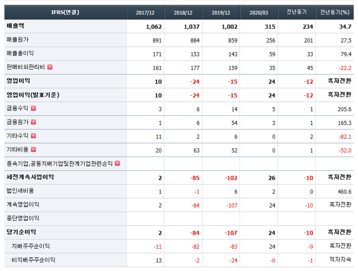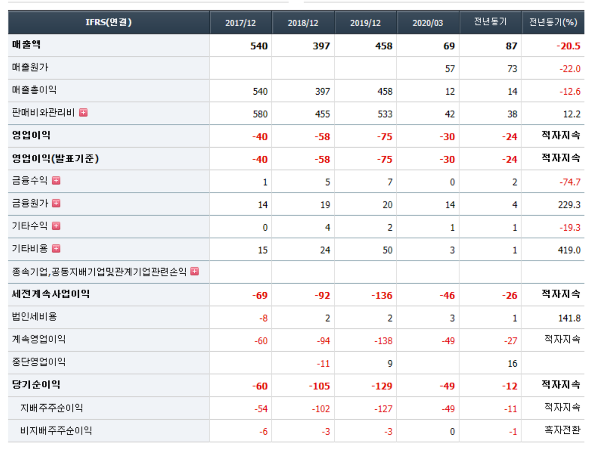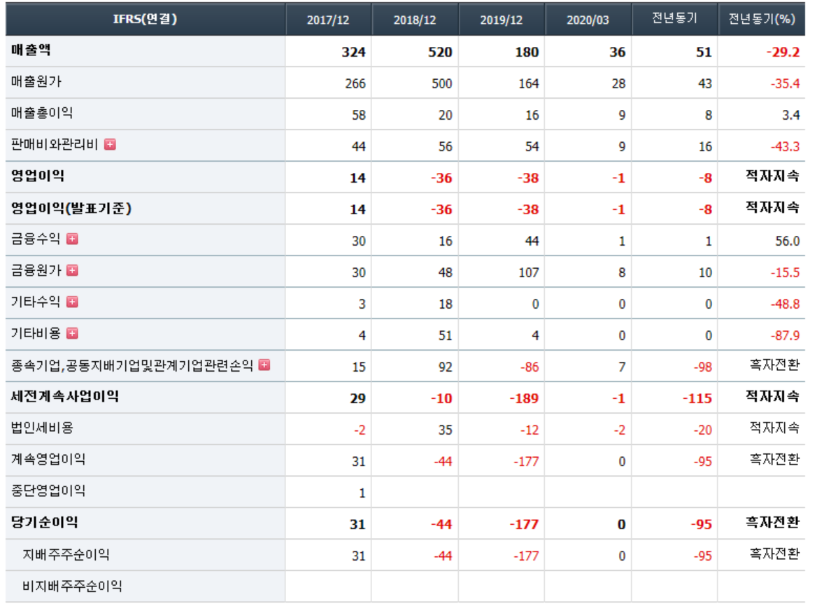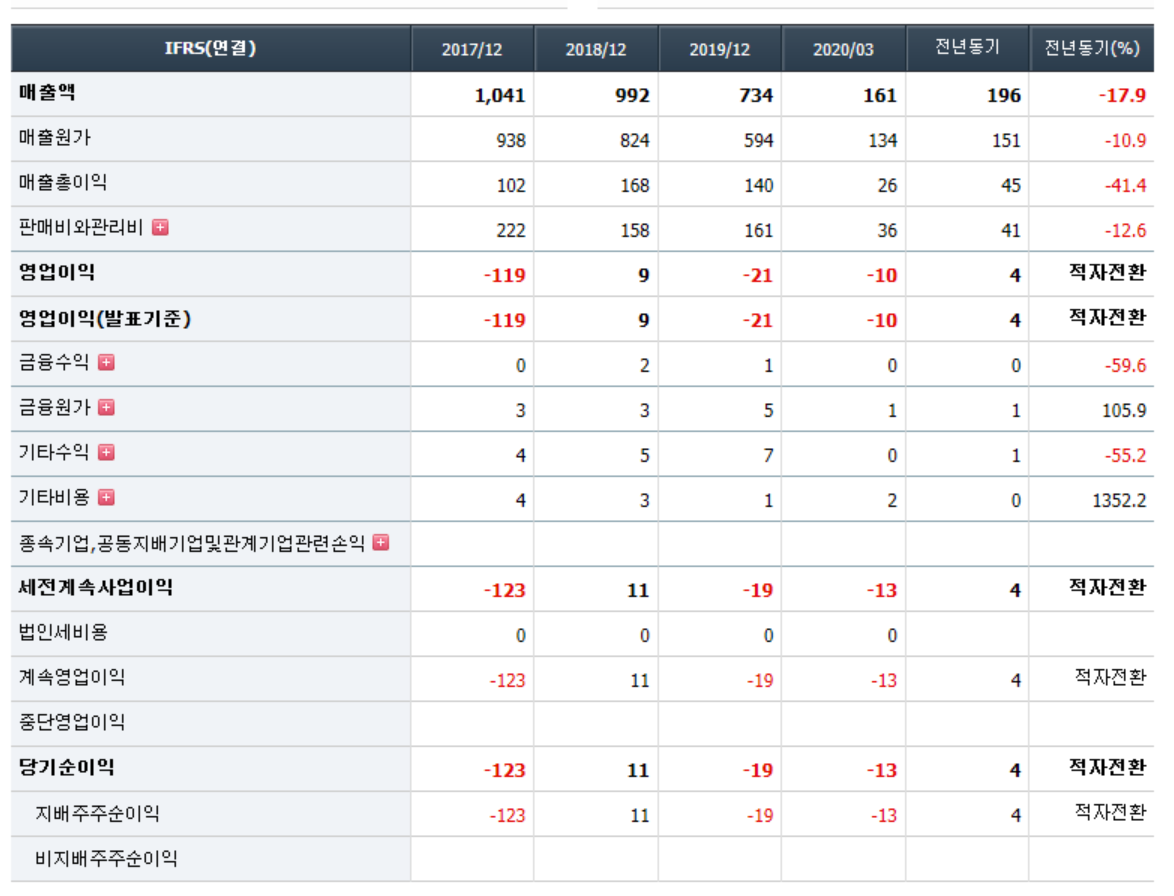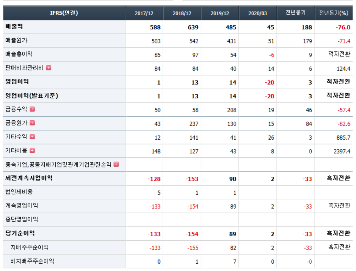 - 2020년 3월 전년동기 대비 연결기준 매출액은 20.5% 감소, 영업손실은 26.6% 증가, 당기순손실은 352.4% 증가. 매니지먼트사업부와 유통사업부 실적이 개선세를 보이고 있으나, Samsung Music 서비스 위탁 운영의 종료로 컨텐츠 매출 큰폭으로 감소하면서 실적 부진 지속됨. 컨텐츠의 부진한 실적과 판관비용의 증가, 이자 및 파생상품평가손실 등의 금융비용의 증가 영향으로 순이익 적자 폭 확대.