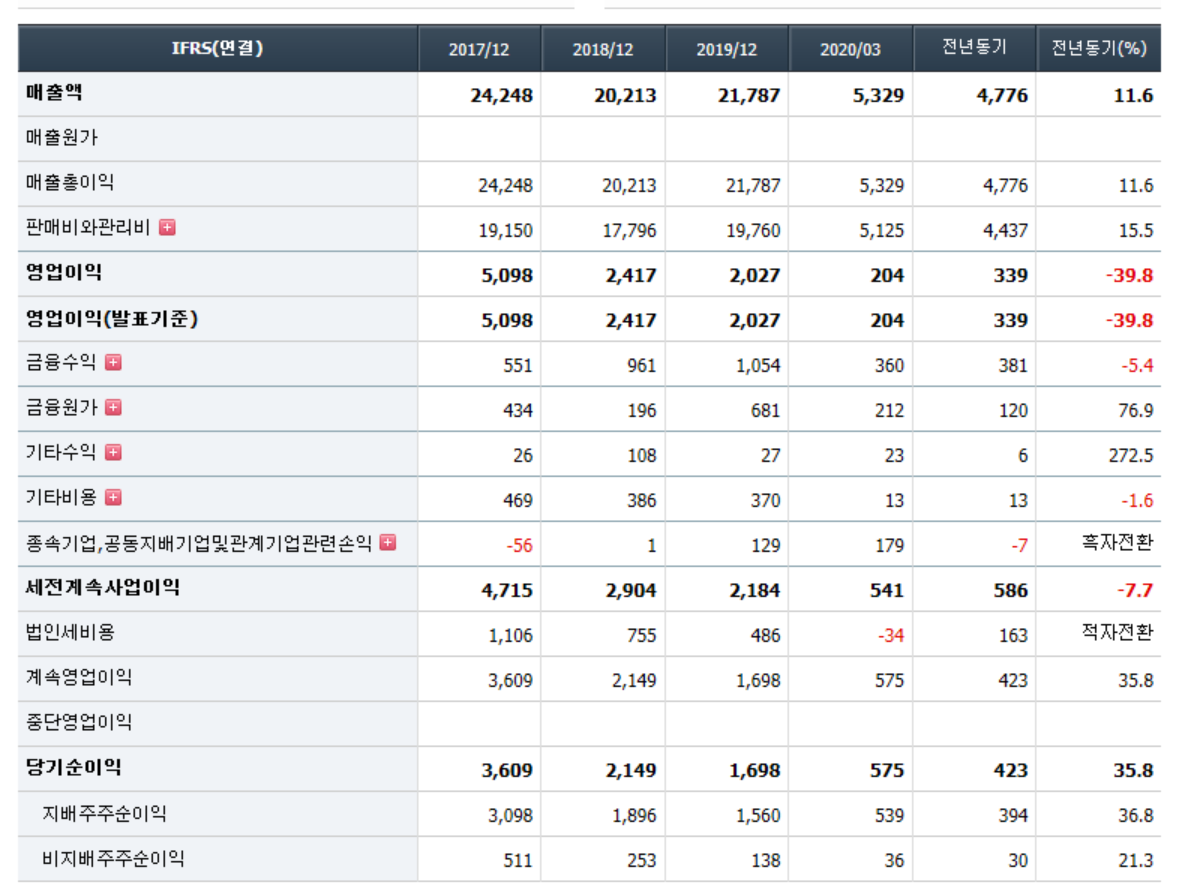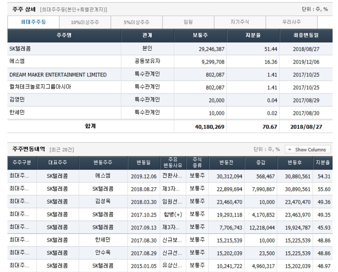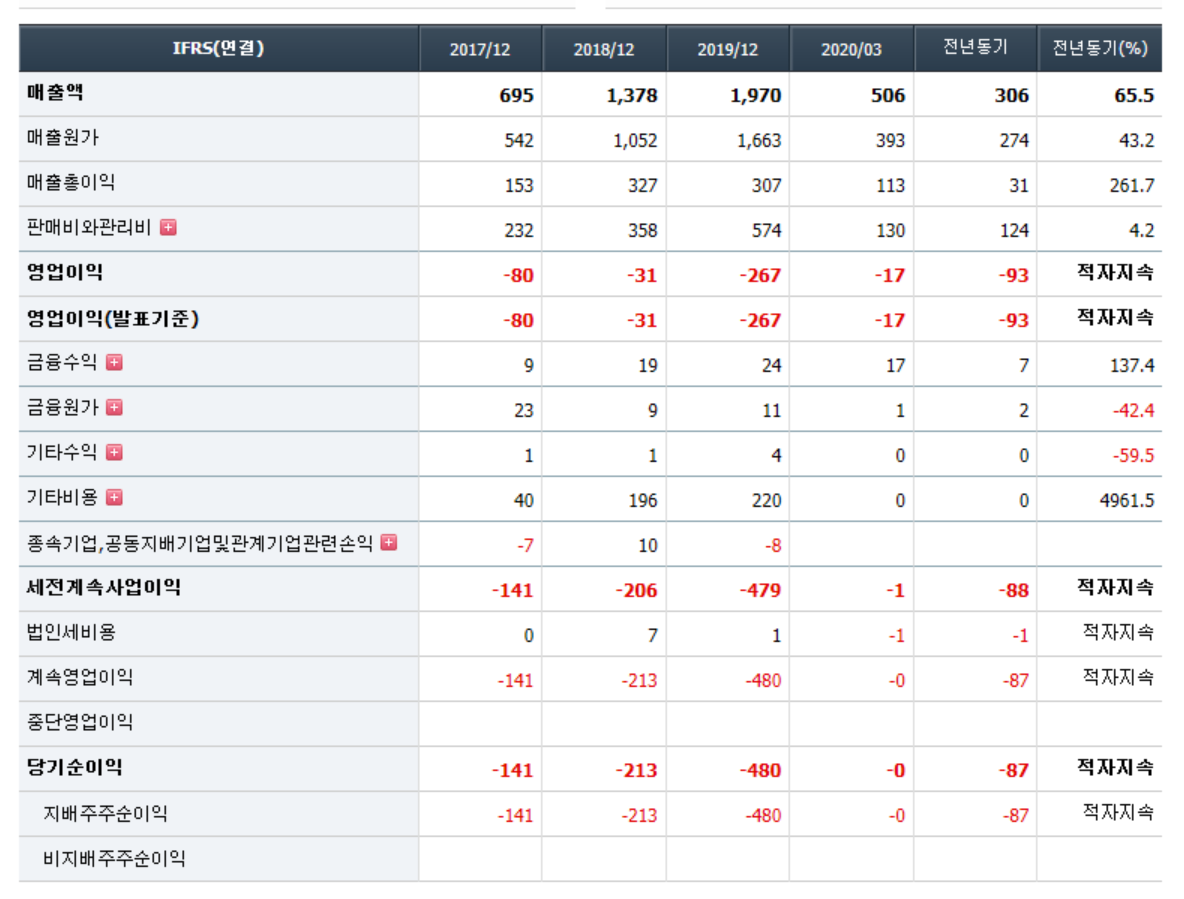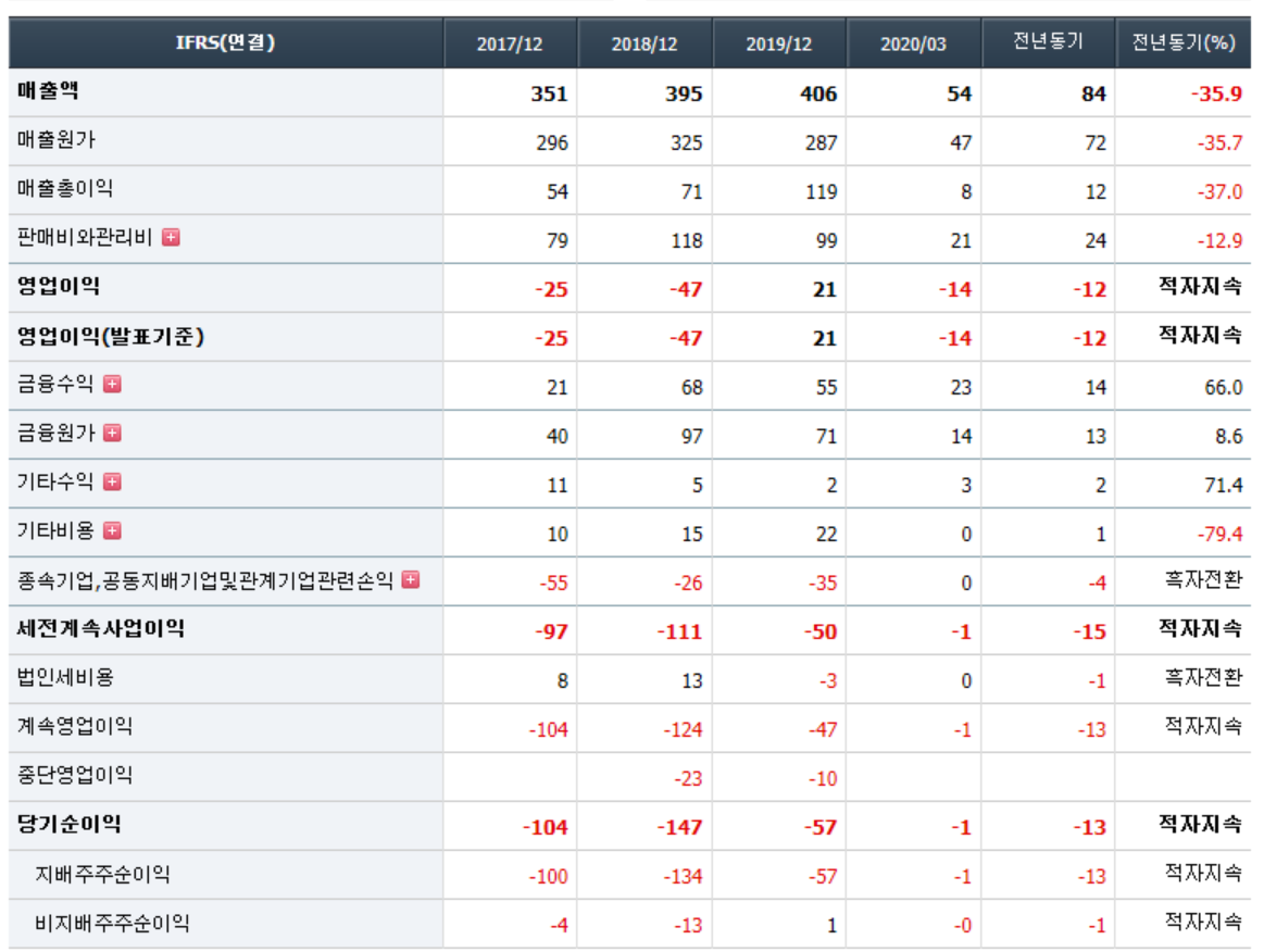 - 2020년 3월 전년동기 대비 연결기준 매출액은 20.5% 감소, 영업손실은 26.6% 증가, 당기순손실은 352.4% 증가. 매니지먼트사업부와 유통사업부 실적이 개선세를 보이고 있으나, Samsung Music 서비스 위탁 운영의 종료로 컨텐츠 매출 큰폭으로 감소하면서 실적 부진 지속됨. 컨텐츠의 부진한 실적과 판관비용의 증가, 이자 및 파생상품평가손실 등의 금융비용의 증가 영향으로 순이익 적자 폭 확대.