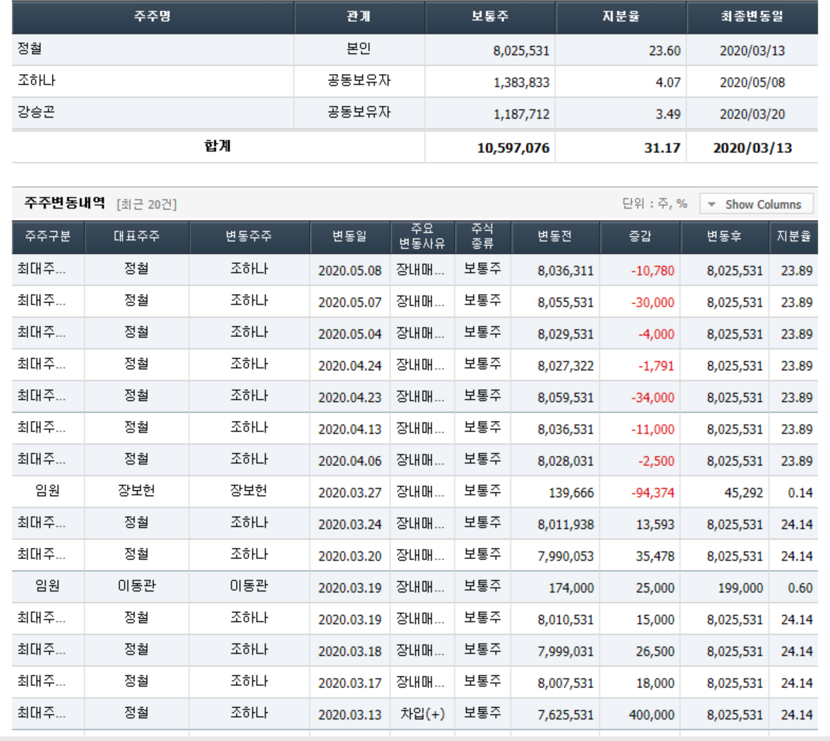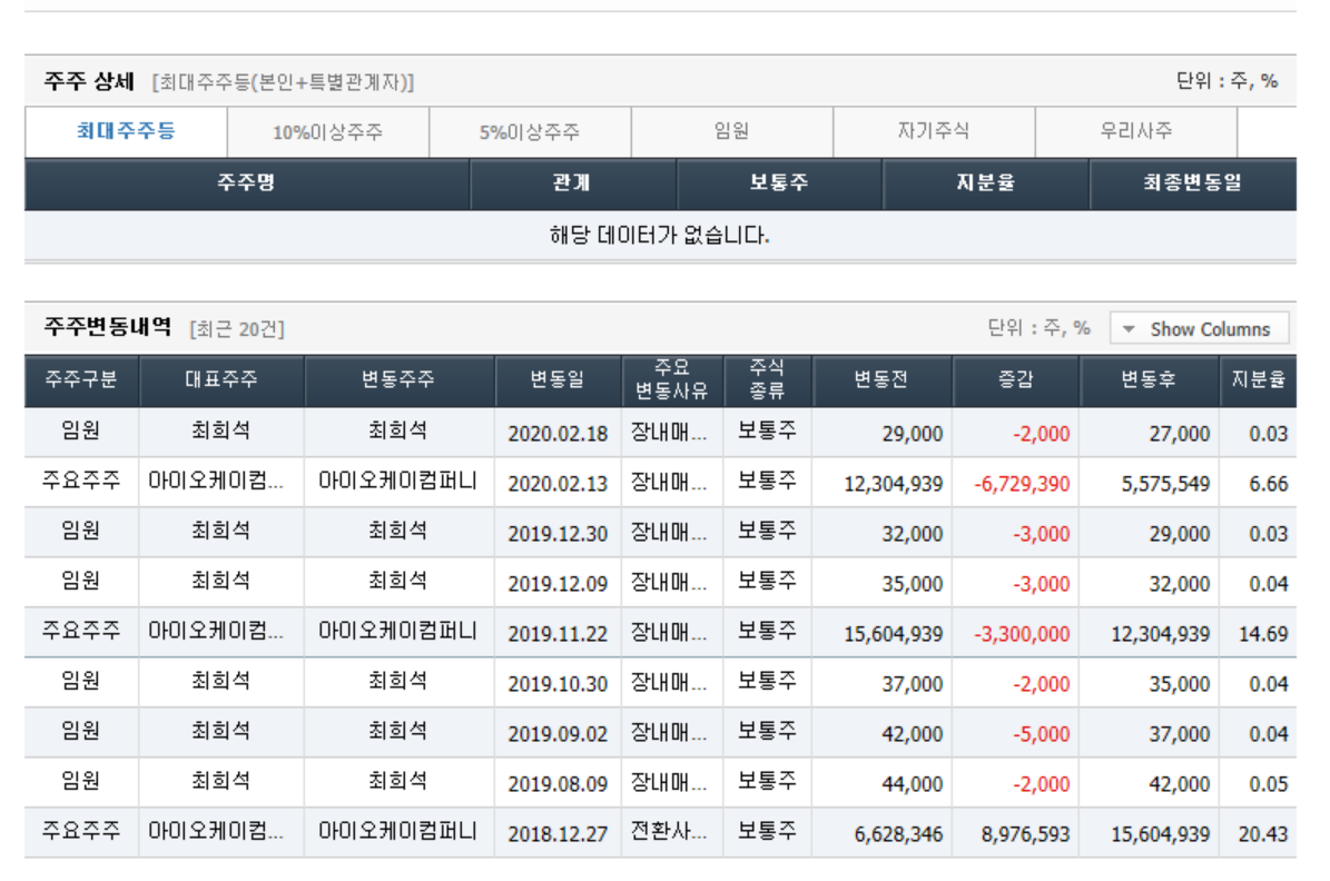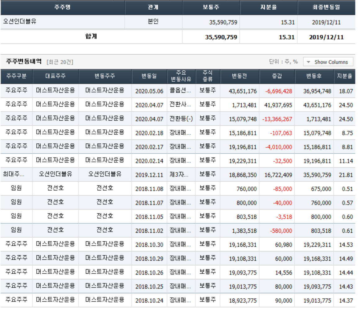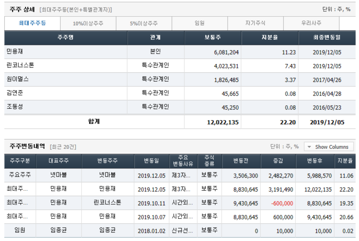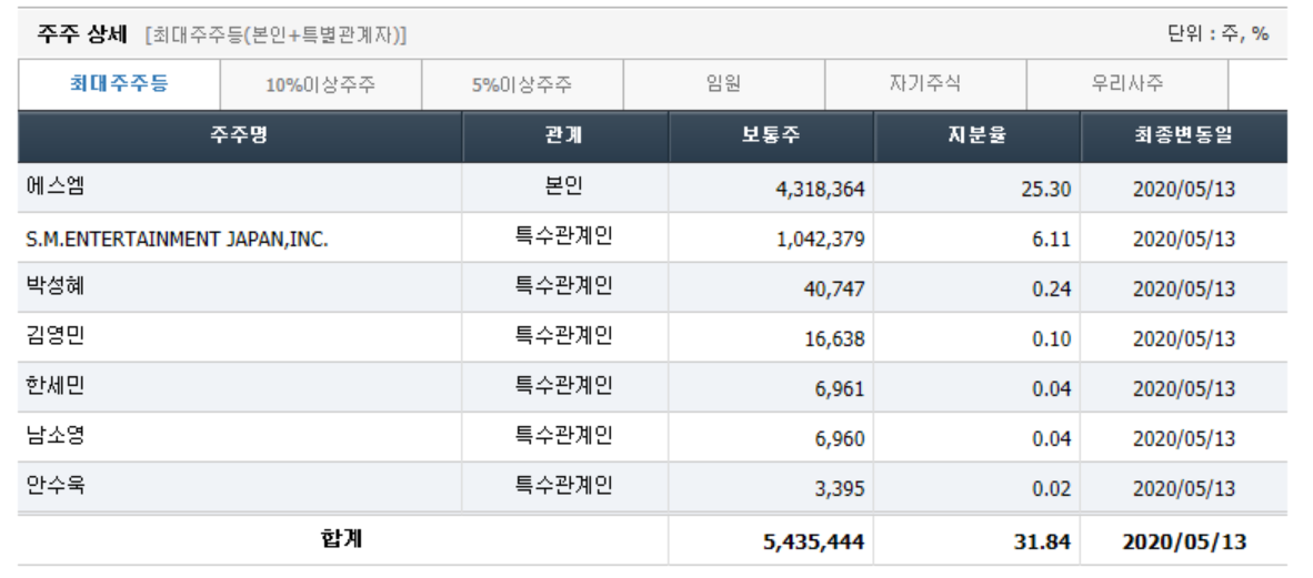 - 2020년 3월 전년동기 대비 연결기준 매출액은 20.5% 감소, 영업손실은 26.6% 증가, 당기순손실은 352.4% 증가. 매니지먼트사업부와 유통사업부 실적이 개선세를 보이고 있으나, Samsung Music 서비스 위탁 운영의 종료로 컨텐츠 매출 큰폭으로 감소하면서 실적 부진 지속됨. 컨텐츠의 부진한 실적과 판관비용의 증가, 이자 및 파생상품평가손실 등의 금융비용의 증가 영향으로 순이익 적자 폭 확대.
