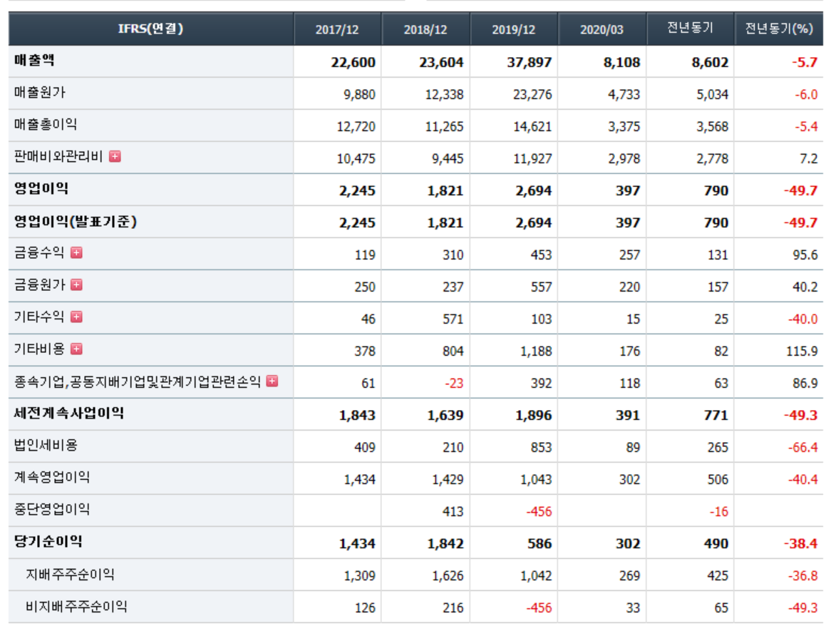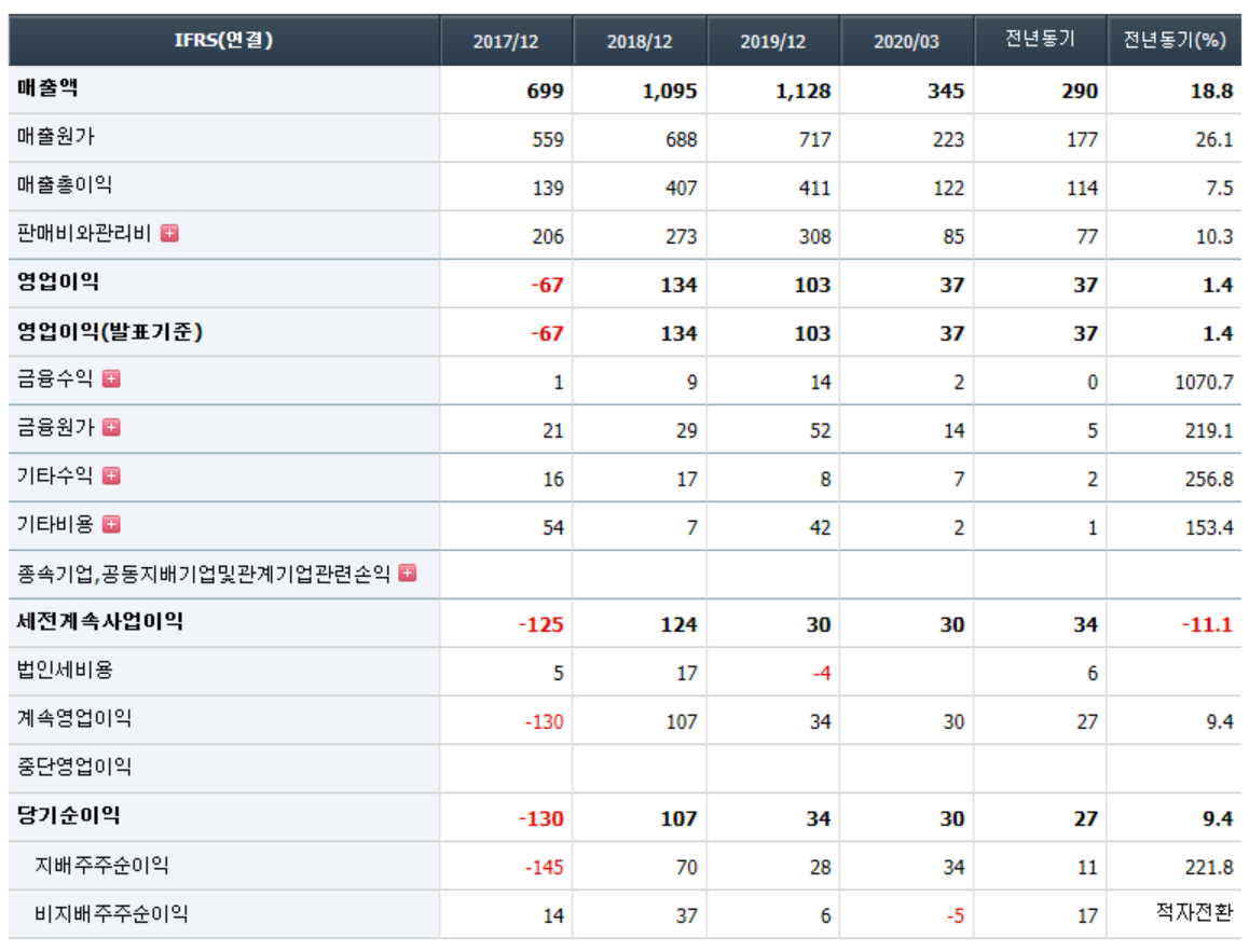- 2020년 3월 전년동기 대비 연결기준 매출액은 18.8% 증가, 영업이익은 1.4% 증가, 당기순이익은 221.8% 증가. 화장품 사업부의 판매 호조로 매출액이 증가하였음. 이자비용의 증가와 금융자산평가손실에도 불구하고, 법인세 감소의 영향으로 당기순이익이 증가하였음. 화장품 사업부는 중국시장을 타겟으로 매출이 확대되고 있으나, 미국 및 일본 시장 등에 새롭게 판로를 개척할 예정임.