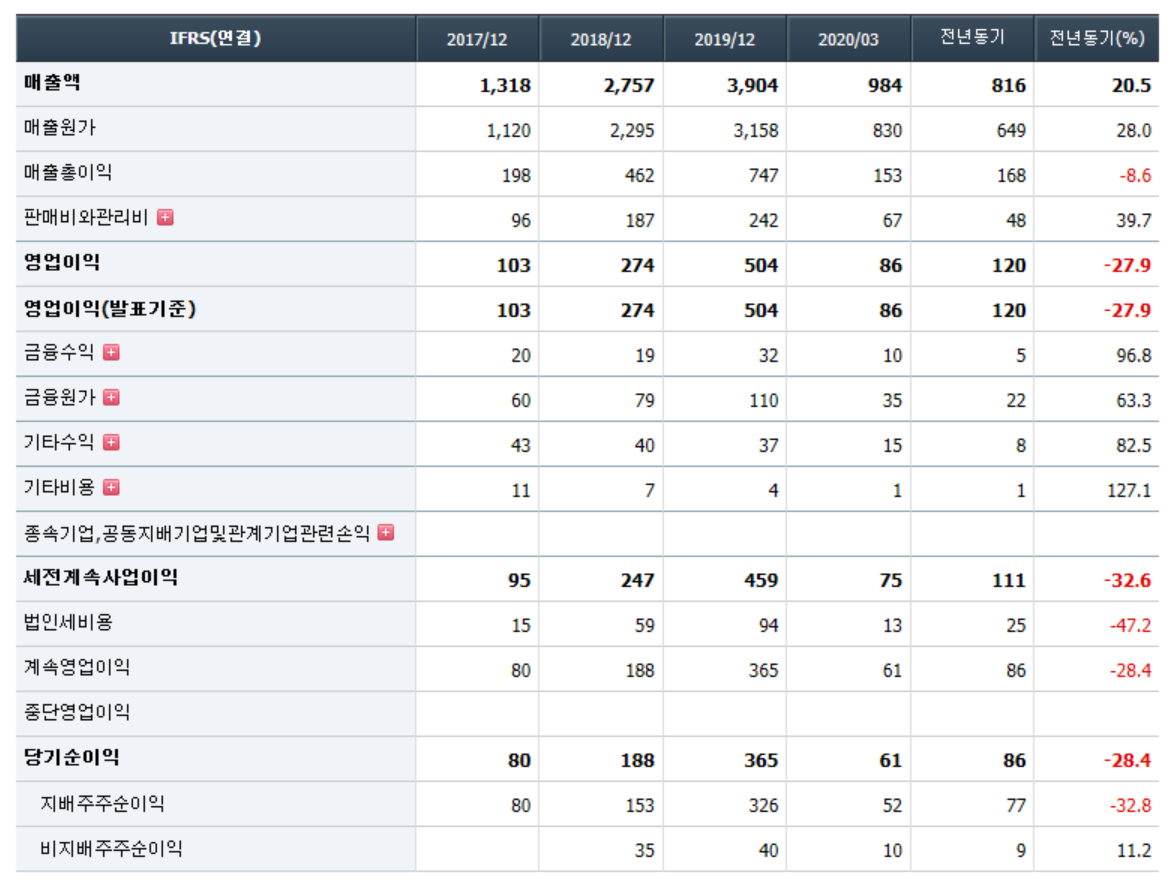 - 2020년 3월 전년동기 대비 연결기준 매출액은 0.8% 증가, 영업이익은 177.3% 증가, 당기순이익은 336.2% 증가. 동사 매출액은 소폭 증가했으나 매출원가는 감소하여 영업이익이 큰 폭으로 개선되었음. 동사는 전자레인지에 장착되어지는 철심형 고압Trans 및 에어컨에 장착되는 REACTOR를 개발하고 있으며, 에어컨용 REACTOR 등의 신규시장 진출을 통해 영업력을 확대할 전망임.