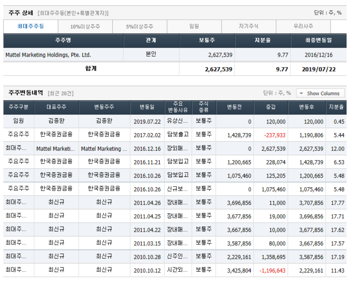 - 동사는 1996년 12월 30일에 설립되었으며, 2005년 1월 7일 코스닥시장에 주식을 상장함. 동사는 캐릭터 완구인 빠샤메카드, 헬로카봇, 엑스가리온 및 마텔 완구인 피셔프라이스, 바비, 핫휠, BTS인형, 게임으로는 블리자드 패키지, 닌텐도 등을 할인마트 및 온오프라인 시장에 유통함. 캐릭터 완구산업은 캐릭터산업의 OSMU를 바탕으로 다양한 분야로의 활용으로 시장이 확대되고 있음ㅁ.