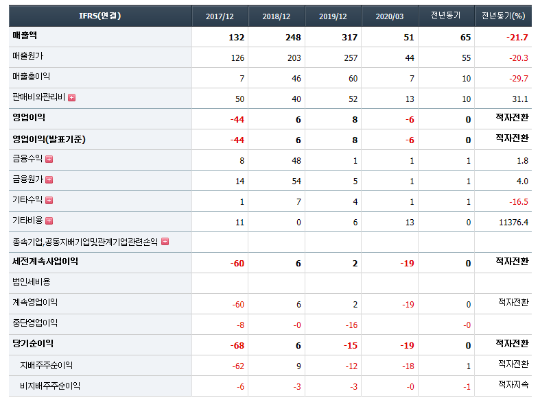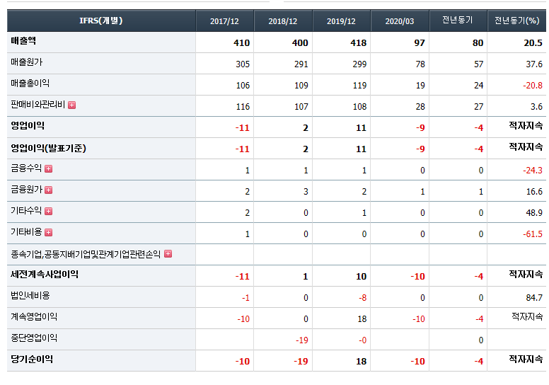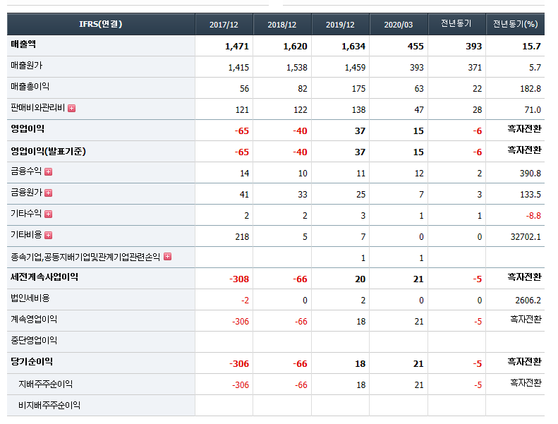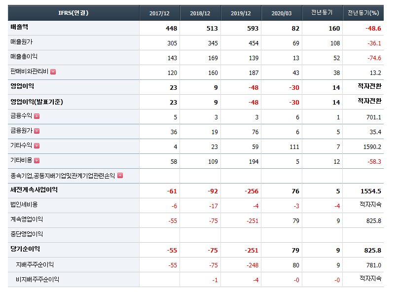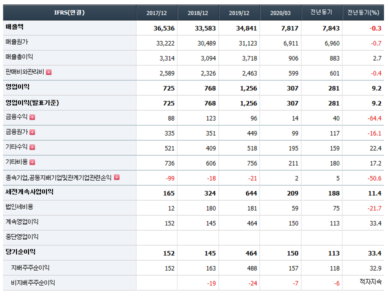 - 2020년 3월 전년동기 대비 연결기준 매출액은 0.3% 감소, 영업이익은 9.2% 증가, 당기순이익은 32.9% 증가. 상대적으로 낮은 시장 인지도를 가지고 있으나, 선택과 집중, 차별화된 경쟁력을 바탕으로 이익 중심의 사업구조 재편하여 재무구조 개선해나가고 있음. 매출액은 전년동기대비 소폭 감소하였으나, 기타영업비용 절감하여 영업이익은 상승함. 비영업부문으로는 법인세비용 절감하여 순이익 상승으로 이어짐.