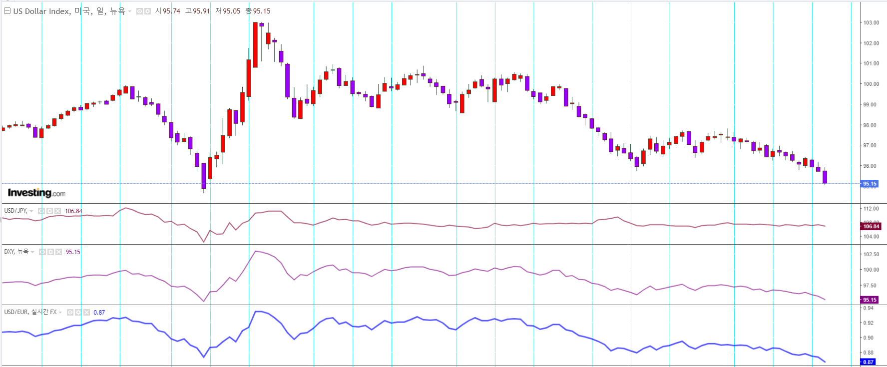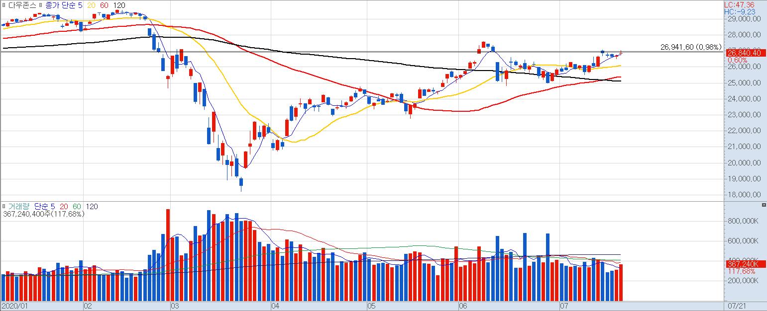 다우 - 뭔가 전환점인가.. 아래 유가가 갭상단을 깨고 올라왔는데... 요거랑 관련이 있는듯.