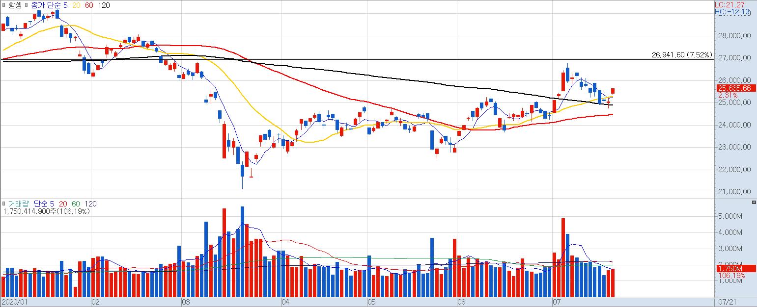 홍콩 - 보안법 이슈 끝나나... 여튼 120선이 하락하고 있으니 홍콩은 하락에 더 무게 .