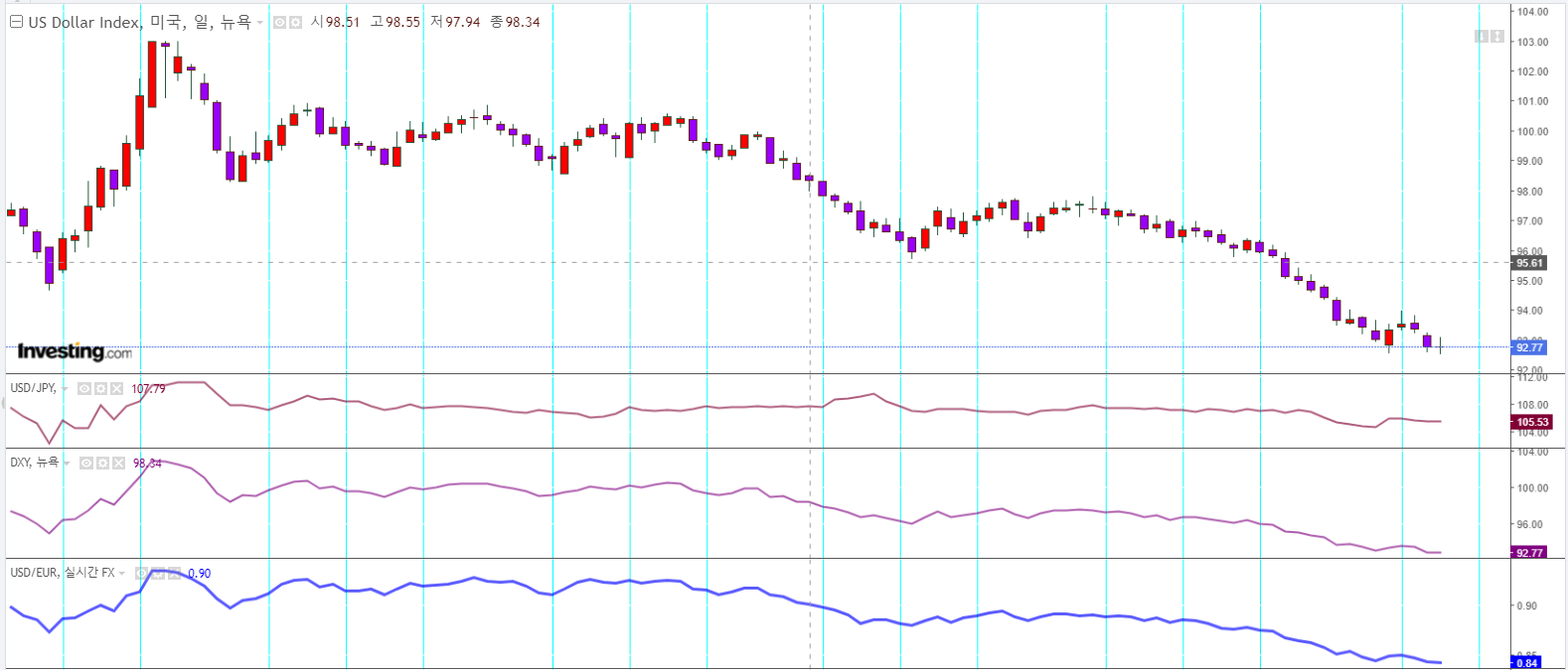 다우 - 상승중. 달러인덱스로 유추해보면, 돈을 엄청 풀고 있는듯 함.