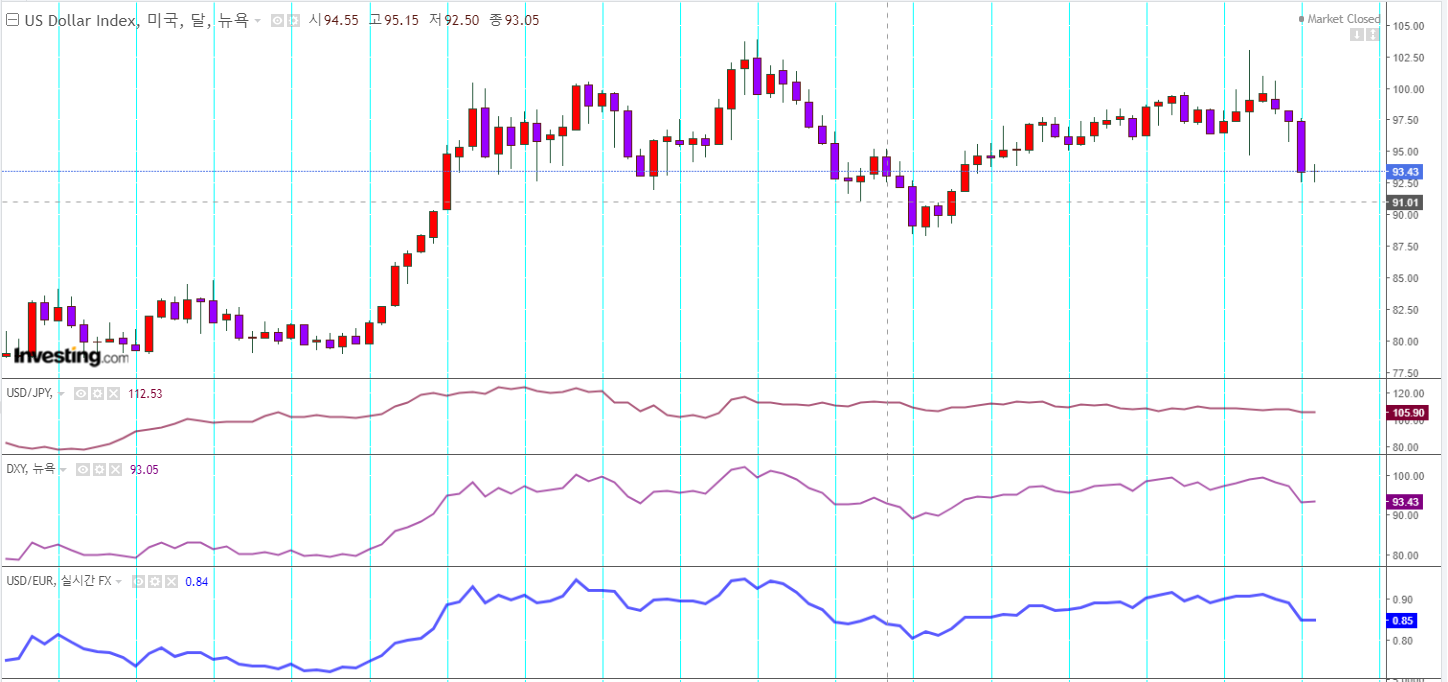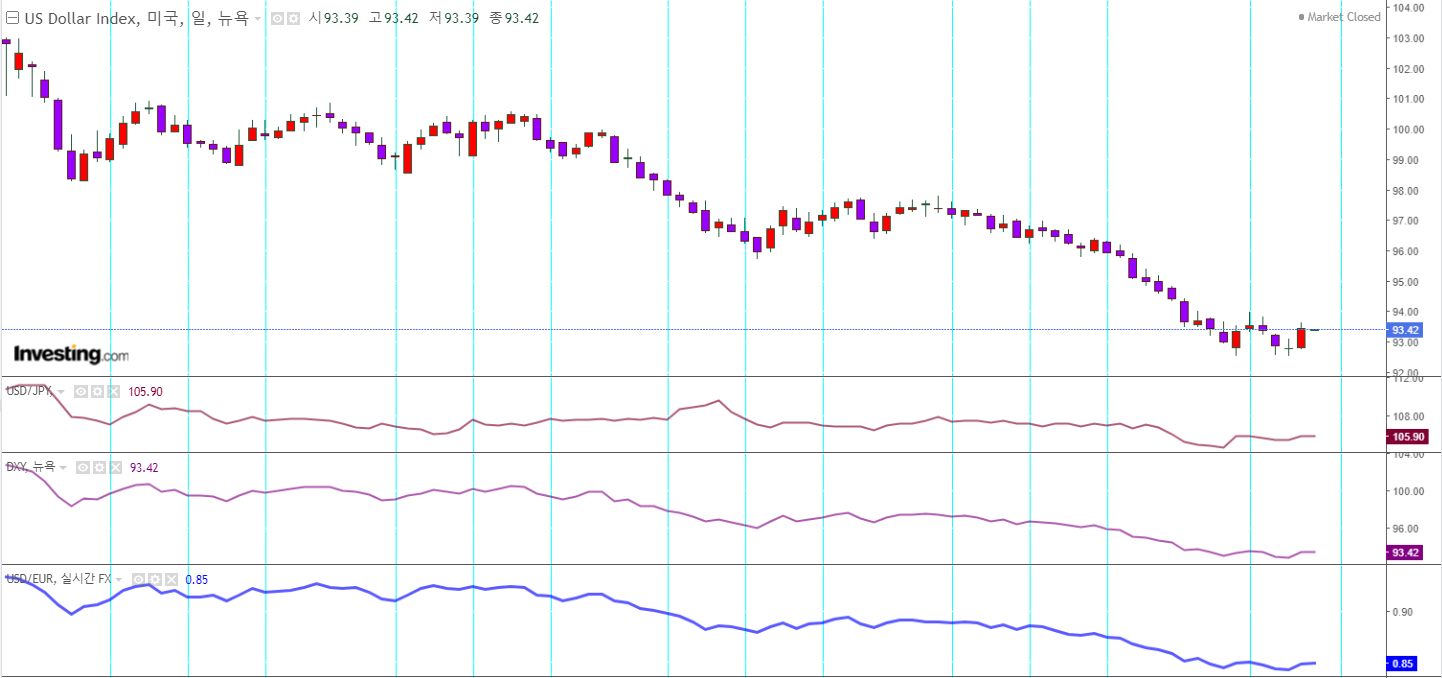 달러인덱스 - 아래서 횡보중이나, 장기로 보면 하락세가 멈추고 잠깐 쉬는중인듯 함.