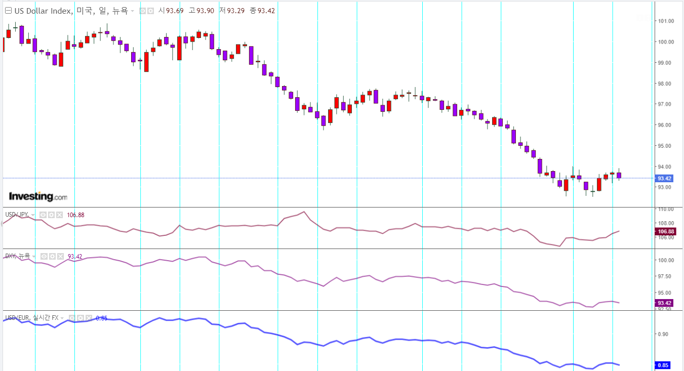 달러인덱스 - 바닥을 한번더 만들수도 있어보임. 일단 하단에서 횡보하고 있슴.