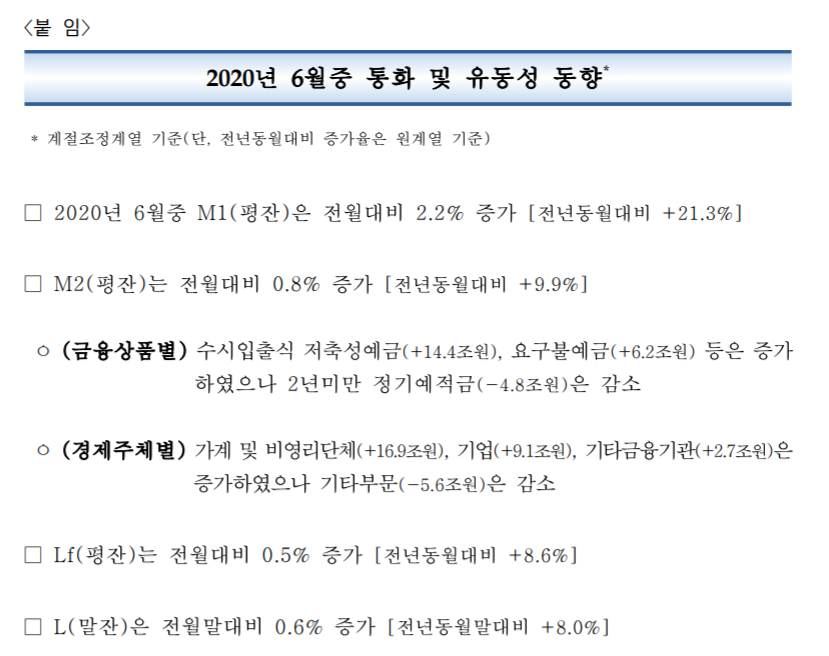 2020년 6월중 통화 및 유동성 | 보도자료(상세) | 커뮤니케이션 | 한국은행 홈페이지
