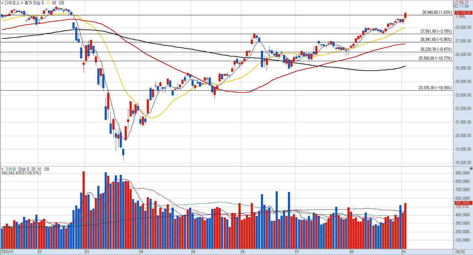다우 - 갭을 다 메웠슴. 전 고점 돌파가 목표.