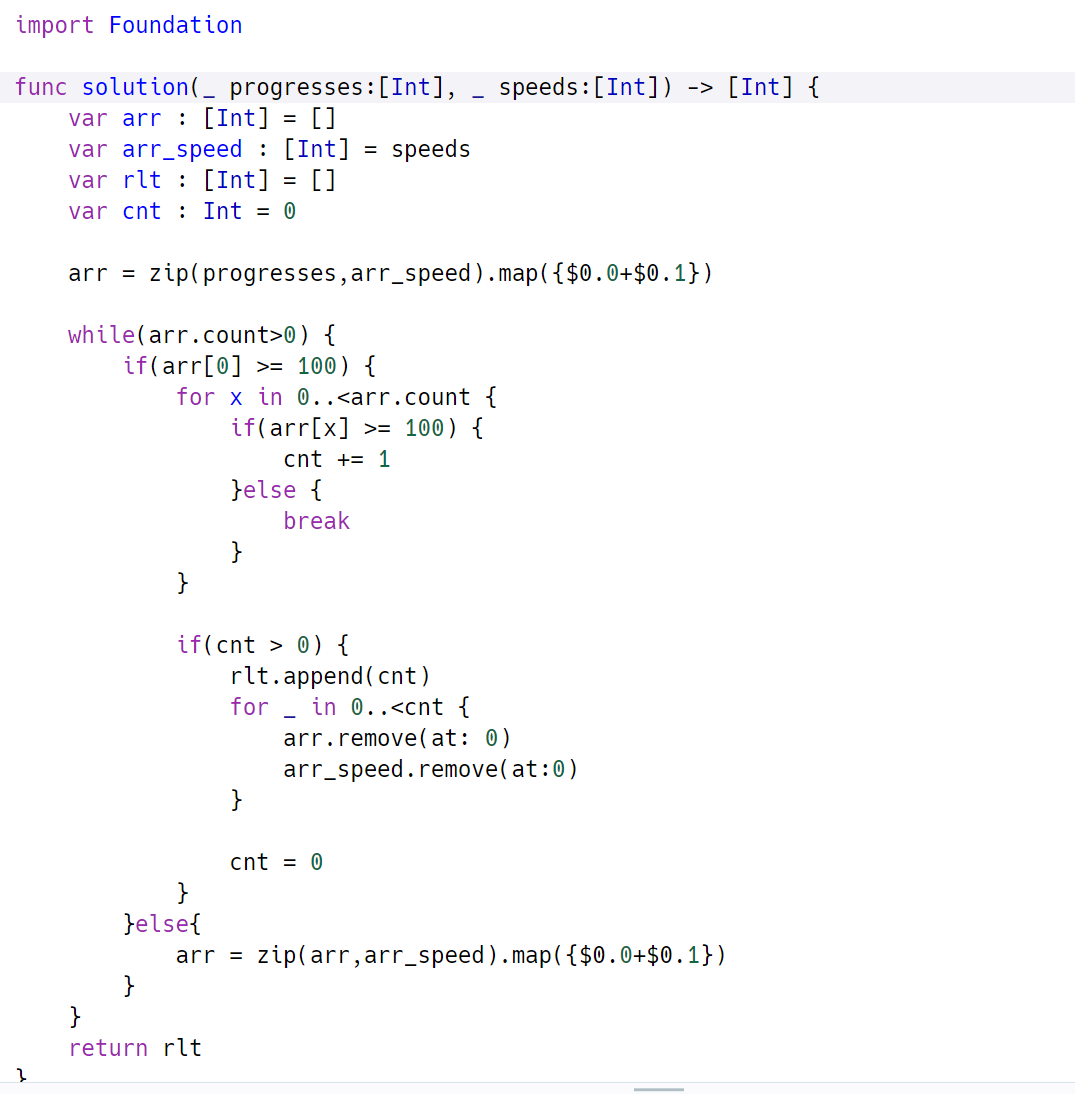 let a: [Int] = [90,30,55] let b : [Int] = [1,30,5] 배열 두개 각 원소끼리 연산을 해야 할때... zip사용... for 문 돌려서 할꺼를 아래와 같이 일괄 처리 하면 1줄로 끝낼 수 있슴. arr_a = zip(prog,per).map(..