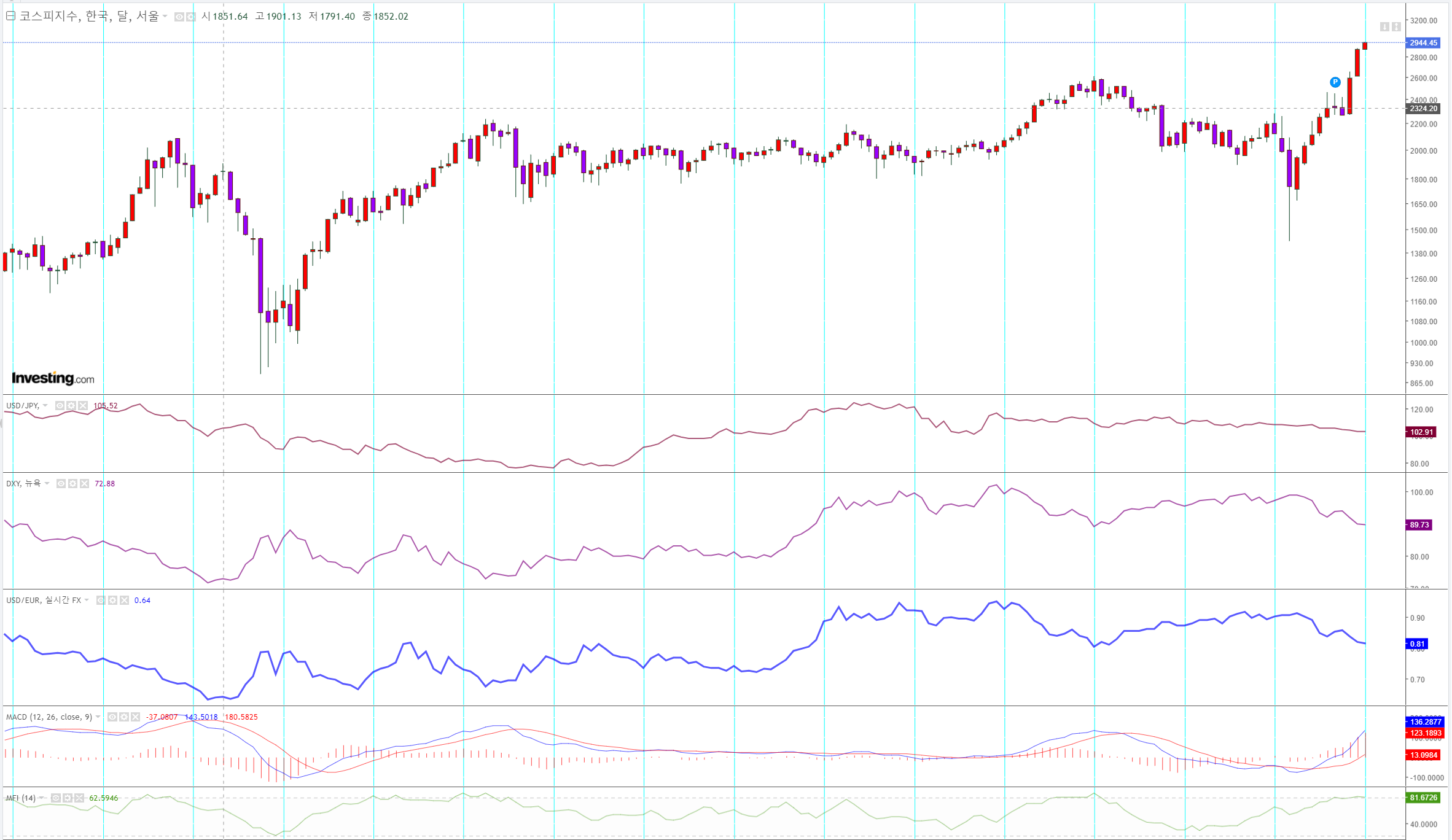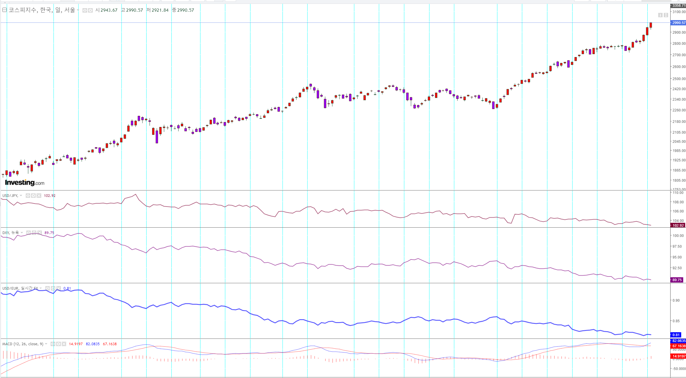 코스피 - 돈가치 하락으로 지수는 지속 상승중.(통화량증가)