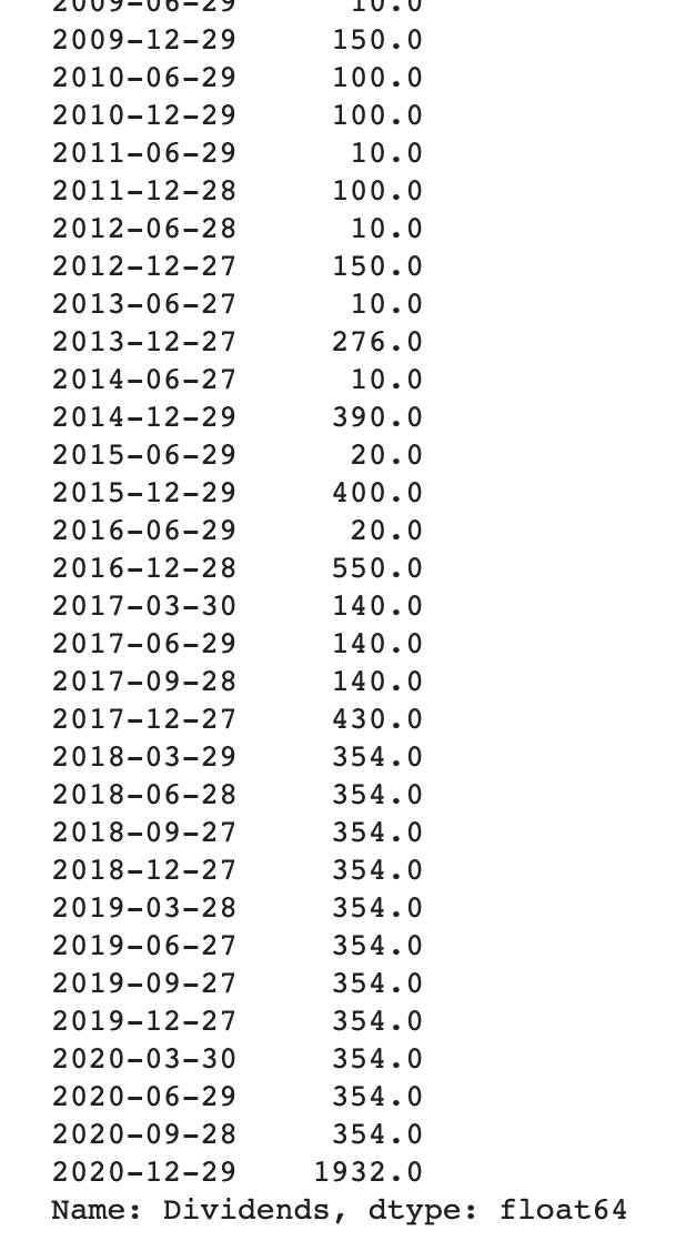 {'52WeekChange': 0.45309734, 'SandP52WeekChange': 0.39881885, 'address1': '129, Samsung-ro', 'address2': 'Yeongtong-gu', 'algorithm': None, 'annualHoldingsTurnover': None, 'annualReportExpenseRatio': None, 'ask': 82000, 'askSize': 0, 'averageDailyVolume10Day': 28246007, 'averageVolume': 29200361, 'averageVolume10days': 28246007, 'beta': 0.908264, 'beta3Year': None, 'bid': 81900, 'bidSize': 0, 'bookValue': None, 'category': None, 'circulatingSupply': None, 'city': 'Suwon-si', 'companyOfficers': [], 'country': 'South Korea', 'currency': 'KRW', 'dateShortInterest': None, 'dayHigh': 82600, 'dayLow': 81100, 'dividendRate': 7728, 'dividendYield': 0.0938, 'earningsQuarterlyGrowth': 0.233, 'enterpriseToEbitda': 7.107, 'enterpriseToRevenue': 1.949, 'enterpriseValue': 461520374857728, 'exDividendDate': 1609200000, 'exchange': 'KSC', 'exchangeTimezoneName': 'Asia/Seoul', 'exchangeTimezoneShortName': 'KST', 'expireDate': None, 'fiftyDayAverage': 84178.79, 'fiftyTwoWeekHigh': 96800, 'fiftyTwoWeekLow': 42300, 'fiveYearAverageReturn': None, 'fiveYearAvgDividendYield': 2.37, 'floatShares': 5532289471, 'forwardEps': None, 'forwardPE': None, 'fromCurrency': None, 'fundFamily': None, 'fundInceptionDate': None, 'gmtOffSetMilliseconds': '32400000', 'heldPercentInsiders': 0.1942, 'heldPercentInstitutions': 0.43768, 'impliedSharesOutstanding': 6792670208, 'industry': 'Consumer Electronics', 'isEsgPopulated': False, 'lastCapGain': None, 'lastDividendDate': 1545868800, 'lastDividendValue': 354, 'lastFiscalYearEnd': 1609372800, 'lastMarket': None, 'lastSplitDate': 1526428800, 'lastSplitFactor': '50:1', 'legalType': None, 'logo_url': 'https://logo.clearbit.com/samsung.com', 'longBusinessSummary': 'Samsung Electronics Co., Ltd. engages in the consumer electronics, information technology and mobile communications, and device solutions businesses worldwide. It offers mobile phones, tablets, wearables, virtual reality, and audio products; TVs, and home theaters; OLED and LCD panels; laptops, computers, chrome books, HDM, memory and system LSI products, monitors, and printers; and home appliances, such as refrigerators, air conditioners, ovens, air purifiers, cooktops and hoods, microwaves, dishwashers, washers, dryers, vacuum cleaners, and heating products, as well as TV and home theater accessories. It also provides security and monitoring, trackers, Wi-Fi routers, hubs, sensors, outlets, and buttons. In addition, the company is involved in the technology and venture capital investment businesses; manufacture of semiconductor equipment and components; and provision of repair services for electronic devices. Further, it provides medical equipment; software development and supply; toll processing of semiconductors and display panels; connected car systems, general logistics agency, financing, marketing, consulting, AI technology research, and cloud services; enterprise automation solutions and connected services; and digital advertising platforms. Additionally, it offers image sensing devices and mobile payment services; and designs and develops software products. The company serves finance, government, healthcare, education, hospitality, transportation, retail, legal, public safety, and manufacturing industries. Samsung Electronics Co., Ltd. was founded in 1938 and is based in Suwon, South Korea.', 'longName': 'Samsung Electronics Co., Ltd.', 'market': 'kr_market', 'marketCap': 550052737056768, 'maxAge': 1, 'maxSupply': None, 'messageBoardId': 'finmb_91868', 'morningStarOverallRating': None, 'morningStarRiskRating': None, 'mostRecentQuarter': 1609372800, 'navPrice': None, 'netIncomeToCommon': 26090846289920, 'nextFiscalYearEnd': 1672444800, 'open': 81100, 'openInterest': None, 'payoutRatio': 0.77949995, 'pegRatio': None, 'phone': '82 31 200 1114', 'previousClose': 82400, 'priceHint': 2, 'priceToBook': None, 'priceToSalesTrailing12Months': 2.3227894, 'profitMargins': 0.11018, 'quoteType': 'EQUITY', 'regularMarketDayHigh': 82600, 'regularMarketDayLow': 81100, 'regularMarketOpen': 81100, 'regularMarketPreviousClose': 82400, 'regularMarketPrice': 81100, 'regularMarketVolume': 20312925, 'revenueQuarterlyGrowth': None, 'sector': 'Technology', 'sharesOutstanding': 5969780224, 'sharesPercentSharesOut': None, 'sharesShort': None, 'sharesShortPreviousMonthDate': None, 'sharesShortPriorMonth': None, 'shortName': 'SamsungElec', 'shortPercentOfFloat': None, 'shortRatio': None, 'startDate': None, 'strikePrice': None, 'symbol': '005930.KS', 'threeYearAverageReturn': None, 'toCurrency': None, 'totalAssets': None, 'tradeable': False, 'trailingAnnualDividendRate': None, 'trailingAnnualDividendYield': None, 'trailingEps': None, 'twoHundredDayAverage': 69714.19, 'volume': 20312925, 'volume24Hr': None, 'volumeAllCurrencies': None, 'website': 'http://www.samsung.com', 'yield': None, 'ytdReturn': None, 'zip': '443-742'}