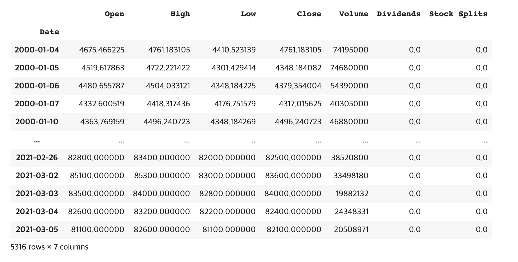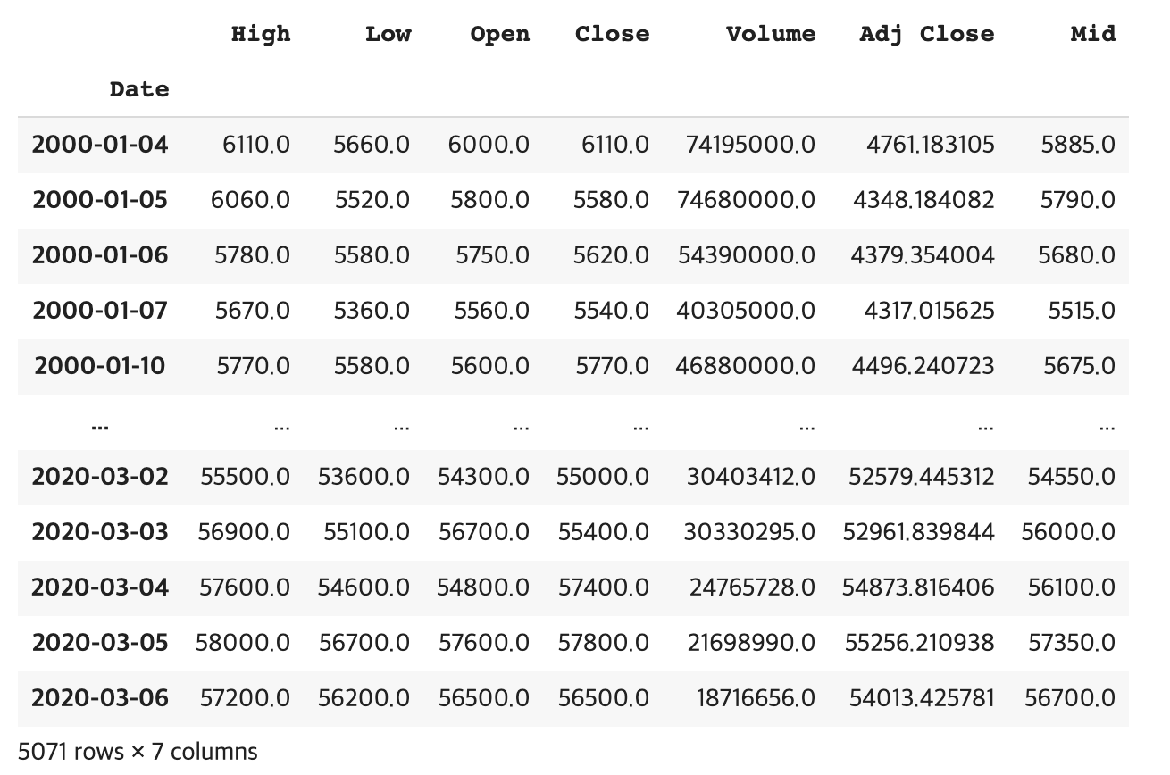 1. 야후 파이낸스 라이브러리를 통하여 수집된 삼전 데이터.